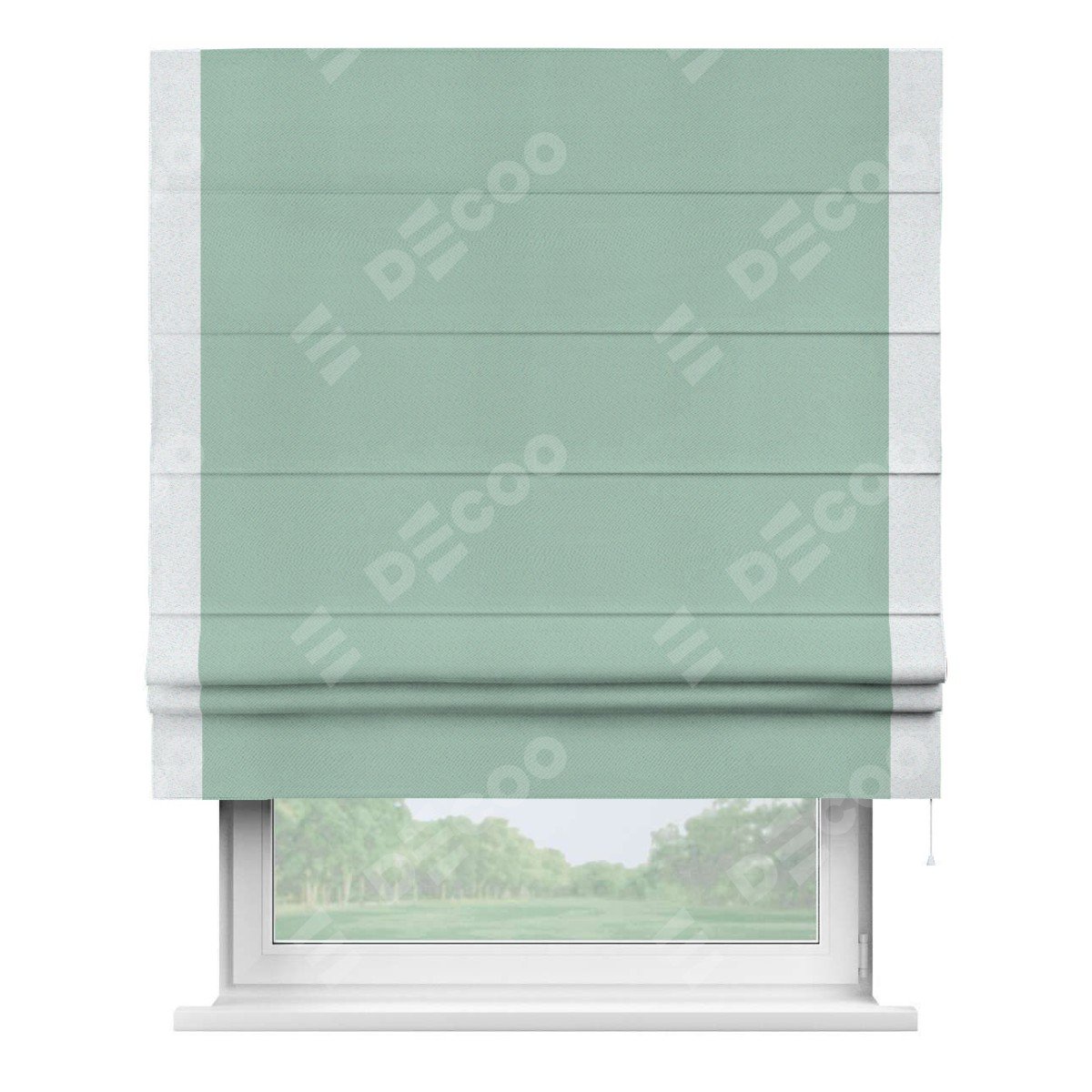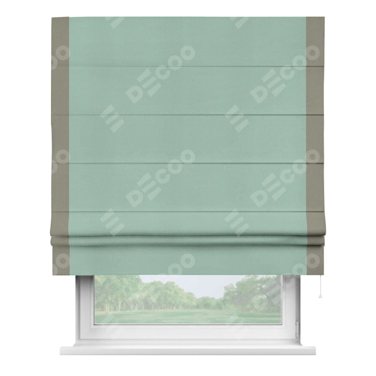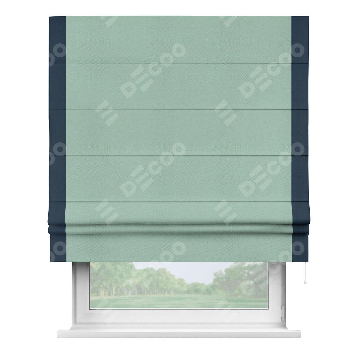 Римская штора производителя «Cortin», используется для проёма, пошита из ткани блэкаут однотонный ментоловый, артикул ткани 29584. Отделка шторы кантом «Стрим Дуо», ткань для канта используется из блэкаута однотонного разной расцветки на выбор. Имеет универсальный механизм и подходит для монтажа: на потолок, на стену и в нишу.