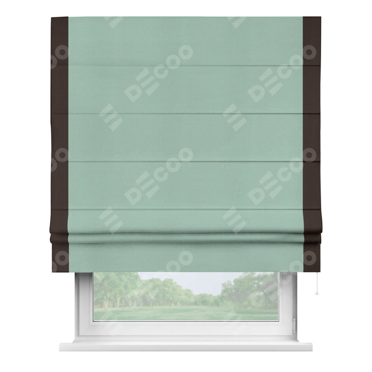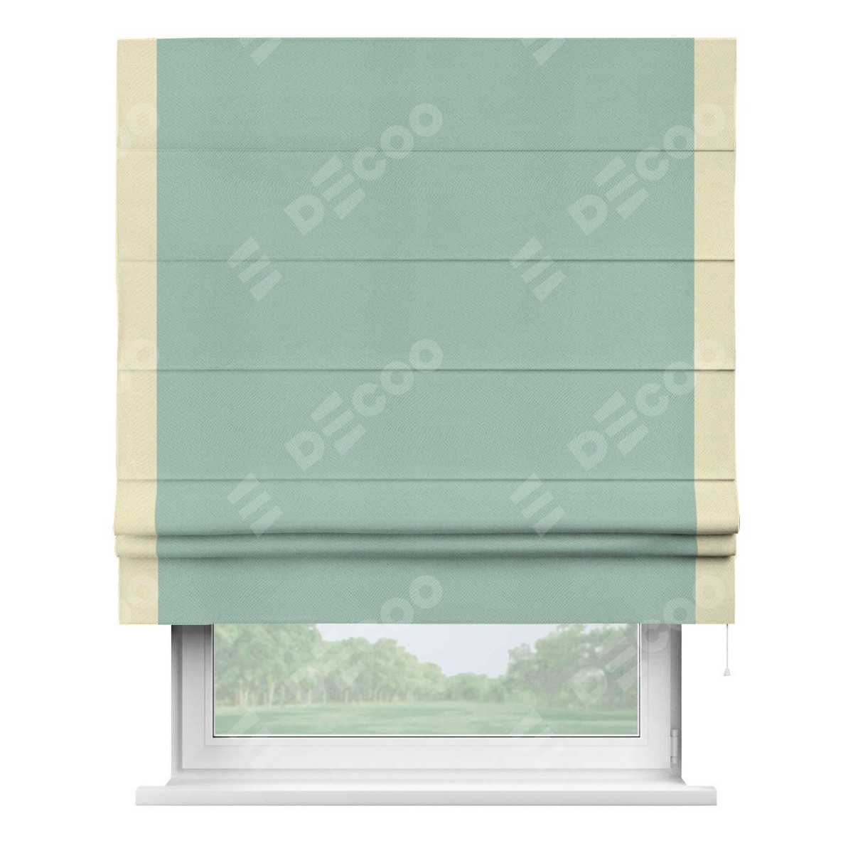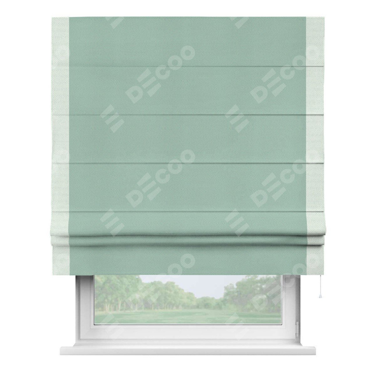 Римская штора производителя «Cortin», используется для проёма, пошита из ткани блэкаут однотонный ментоловый, артикул ткани 29584. Отделка шторы кантом «Стрим Дуо», ткань для канта используется из блэкаута однотонного разной расцветки на выбор. Имеет универсальный механизм и подходит для монтажа: на потолок, на стену и в нишу.