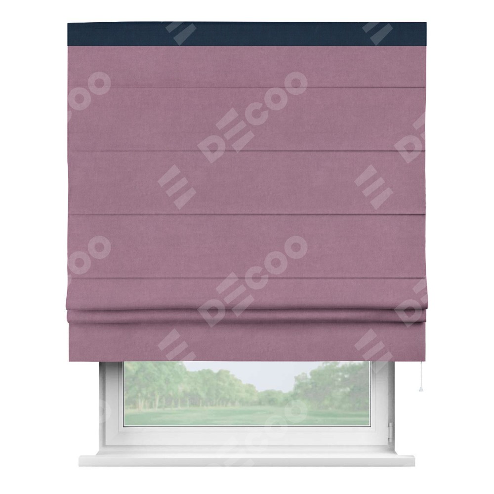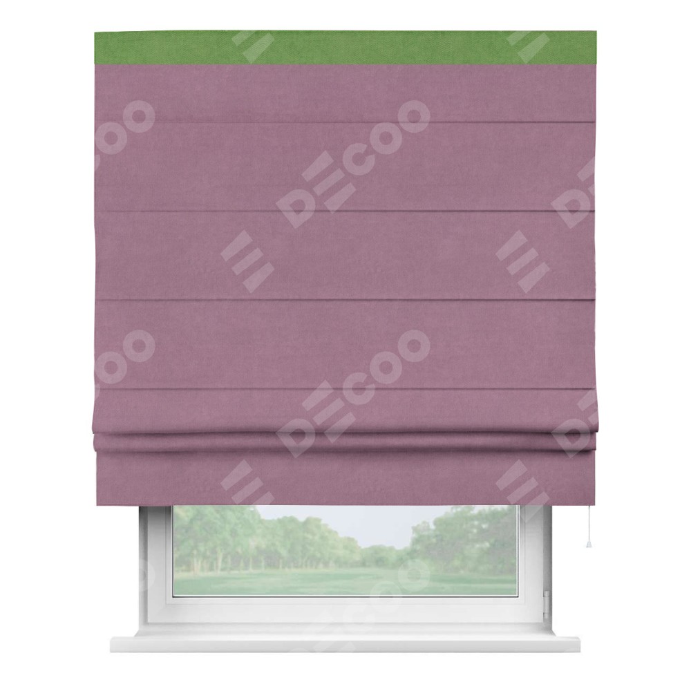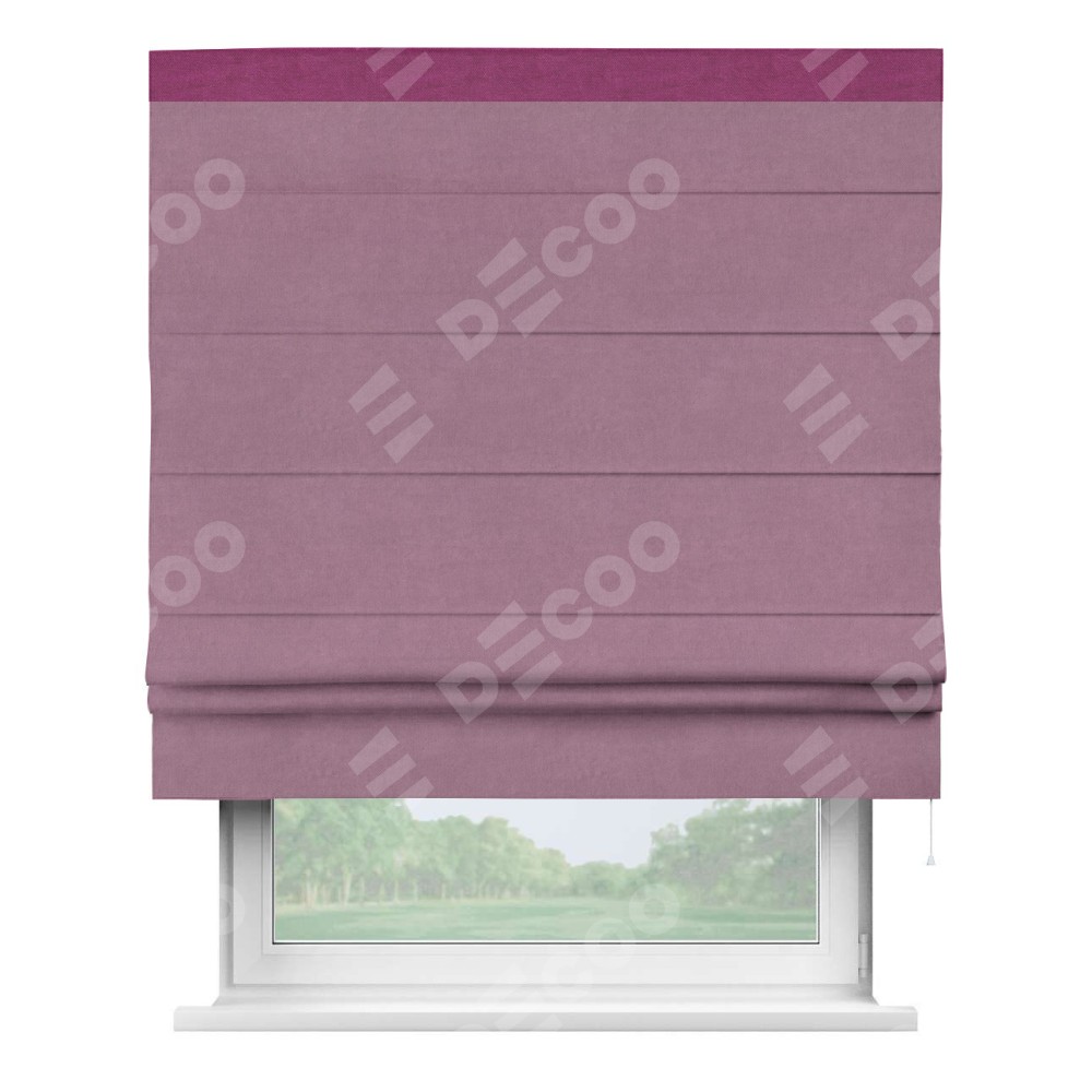 Римская штора производителя «Cortin», используется для проёма, пошита из ткани вельвет лиловый, артикул ткани 17752. Отделка шторы кантом «Кинг», ткань для канта используется из вельвета разной расцветки на выбор. Имеет универсальный механизм и подходит для монтажа: на потолок, на стену и в нишу.