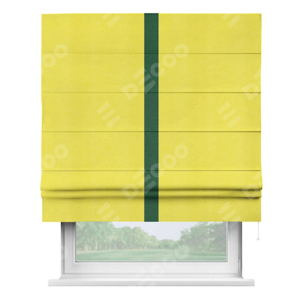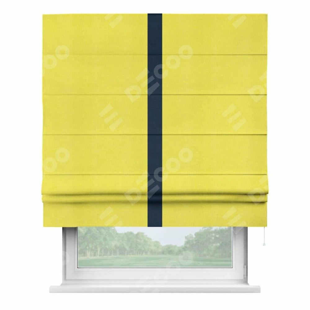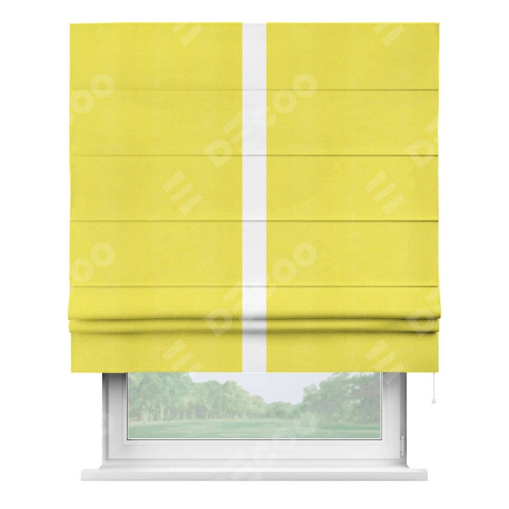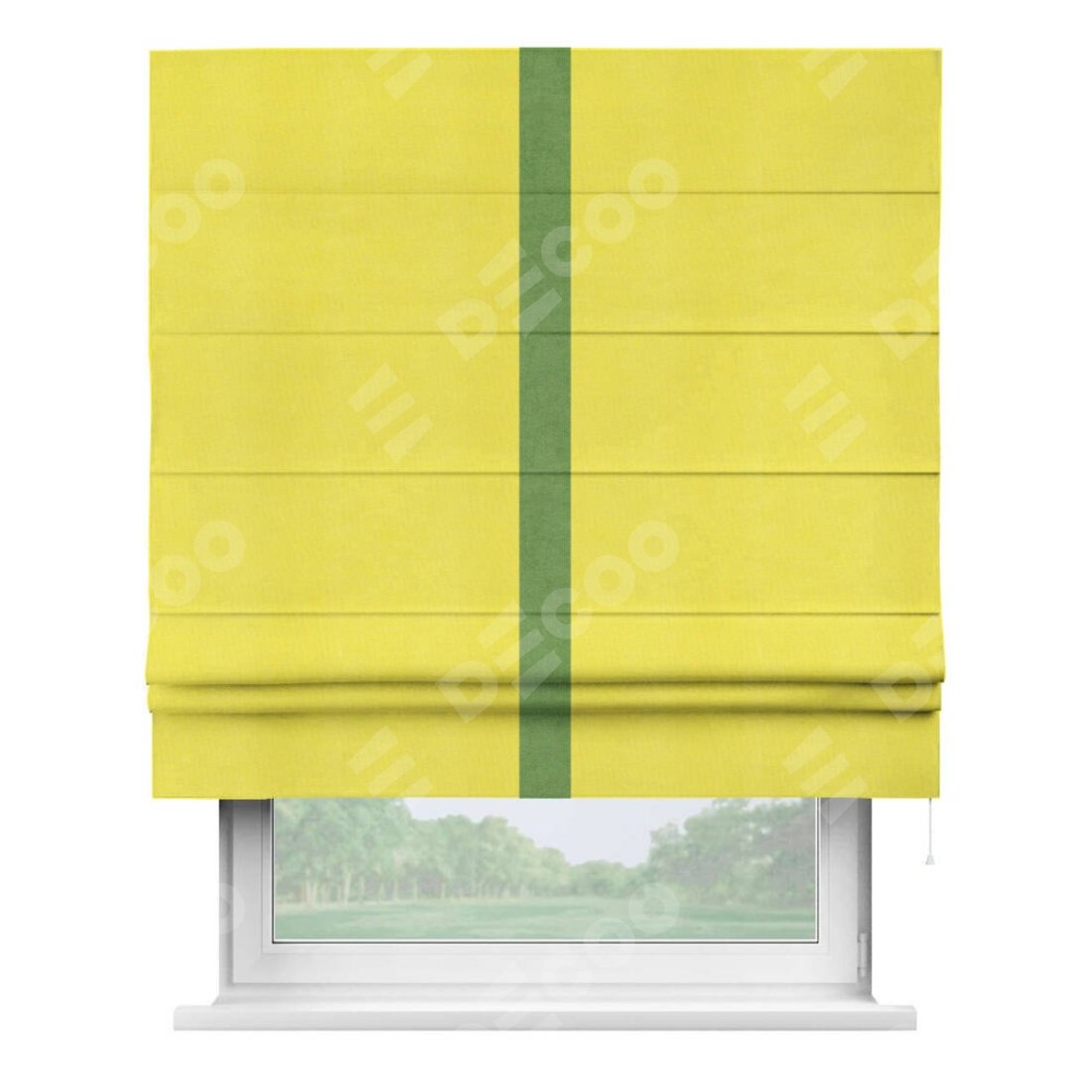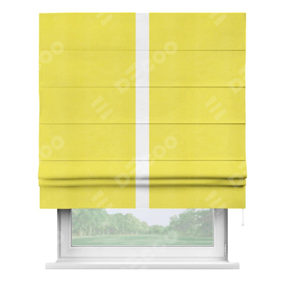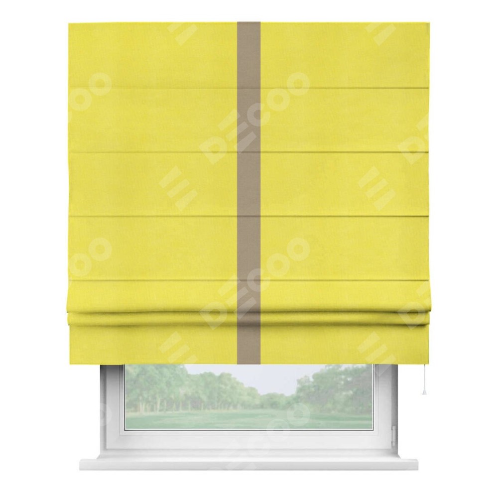 Римская штора производителя «Cortin», используется для проёма, пошита из ткани вельвет cветло-желтый, артикул ткани 30997. Отделка шторы кантом «Хайвей», ткань для канта используется из вельвета разной расцветки на выбор. Имеет универсальный механизм и подходит для монтажа: на потолок, на стену и в нишу.