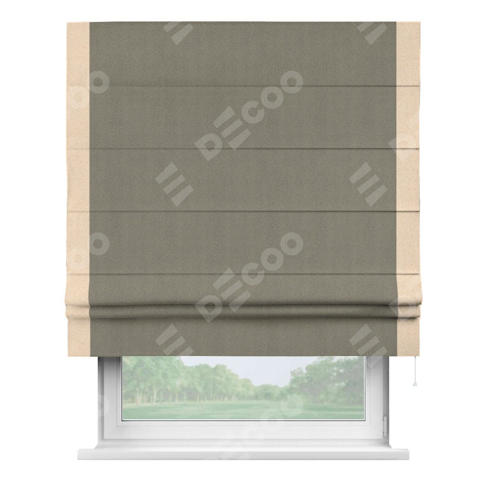 Римская штора производителя «Cortin», используется для проёма, пошита из ткани блэкаут с блеском графитовый, артикул 34648. Отделка шторы кантом «Стрим Дуо», ткань для канта используется из блэкаута с блеском разной расцветки на выбор. Изнаночная сторона материала черного цвета, что обеспечивает необходимую светонепроницаемость. Имеет универсальный механизм и подходит для монтажа: на потолок, на стену и в нишу.