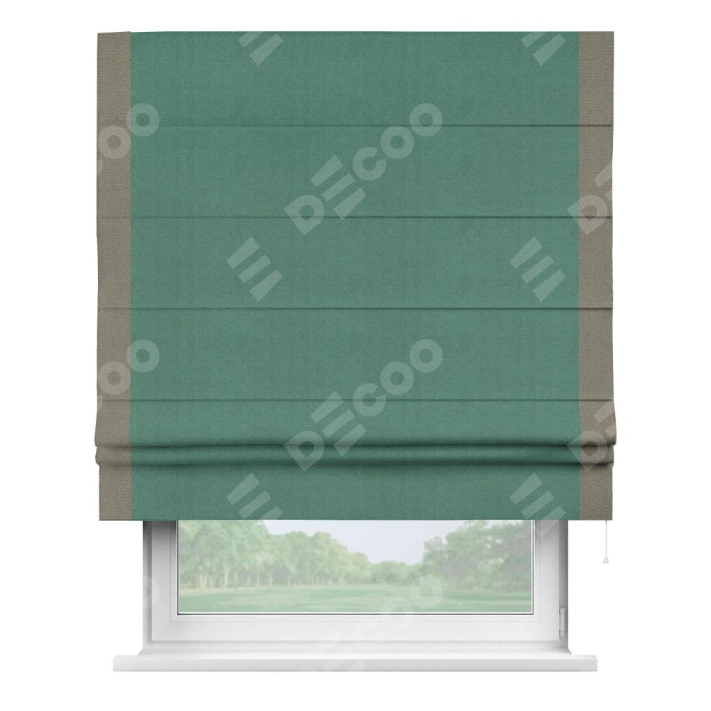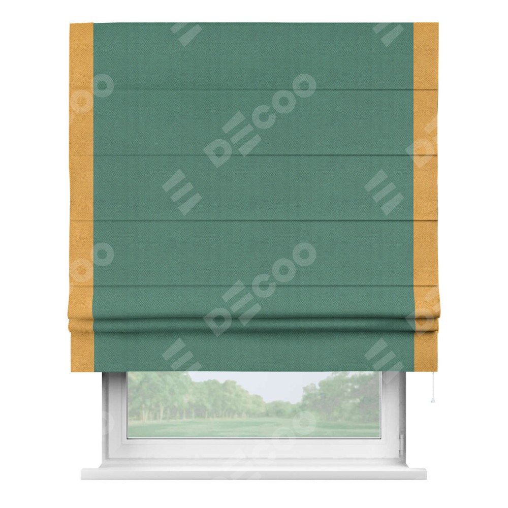 Римская штора производителя «Cortin», используется для проёма, пошита из ткани блэкаут с блеском изумрудный, артикул 34628. Отделка шторы кантом «Стрим Дуо», ткань для канта используется из блэкаута с блеском разной расцветки на выбор. Изнаночная сторона материала черного цвета, что обеспечивает необходимую светонепроницаемость. Имеет универсальный механизм и подходит для монтажа: на потолок, на стену и в нишу.