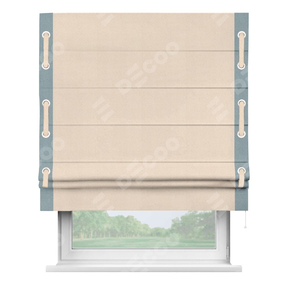Римская штора производителя «Cortin», используется для проёма, пошита из ткани блэкаут с блеском розовая пудра, артикул 34632. Отделка шторы кантом «Стрим Дуо» на кантах расположены люверсы с пояском, ткань для канта используется блэкаут с блеском разной расцветки на выбор. Ткань для пояска обычно используется из основной ткани шторы, а так же можно сделать из любой расцветки по желанию. Изнаночная сторона материала черного цвета, что обеспечивает необходимую светонепроницаемость. Имеет универсальный механизм и подходит для монтажа: на потолок, на стену и в нишу.