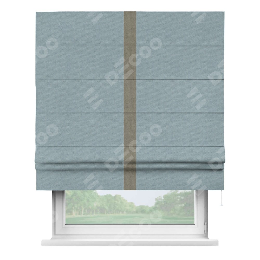 Римская штора производителя «Cortin», используется для проёма, пошита из ткани блэкаут с блеском синий, артикул 34625. Отделка шторы кантом «Хайвэй», ткань для канта используется из блэкаута с блеском разной расцветки на выбор. Изнаночная сторона материала черного цвета, что обеспечивает необходимую светонепроницаемость. Имеет универсальный механизм и подходит для монтажа: на потолок, на стену и в нишу.