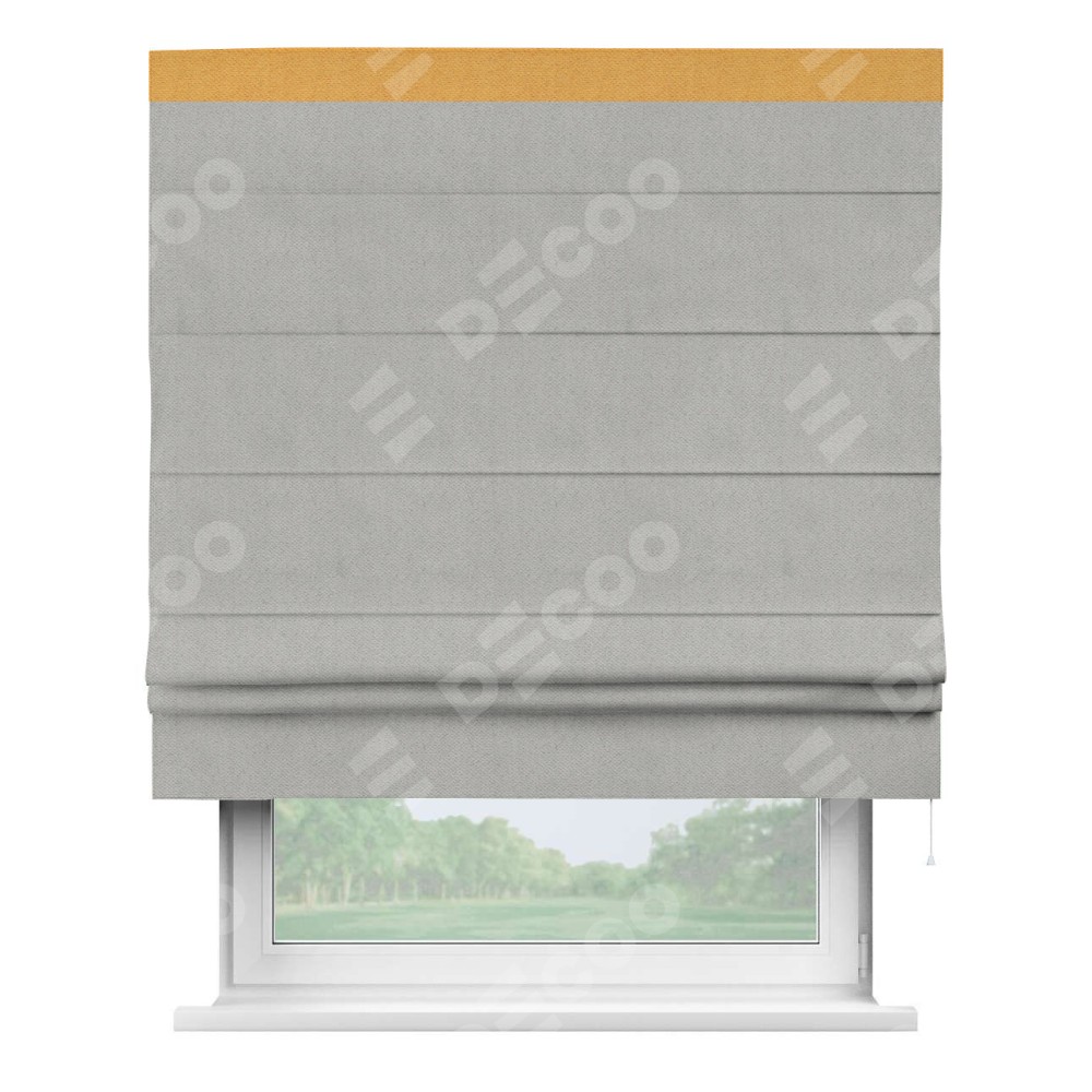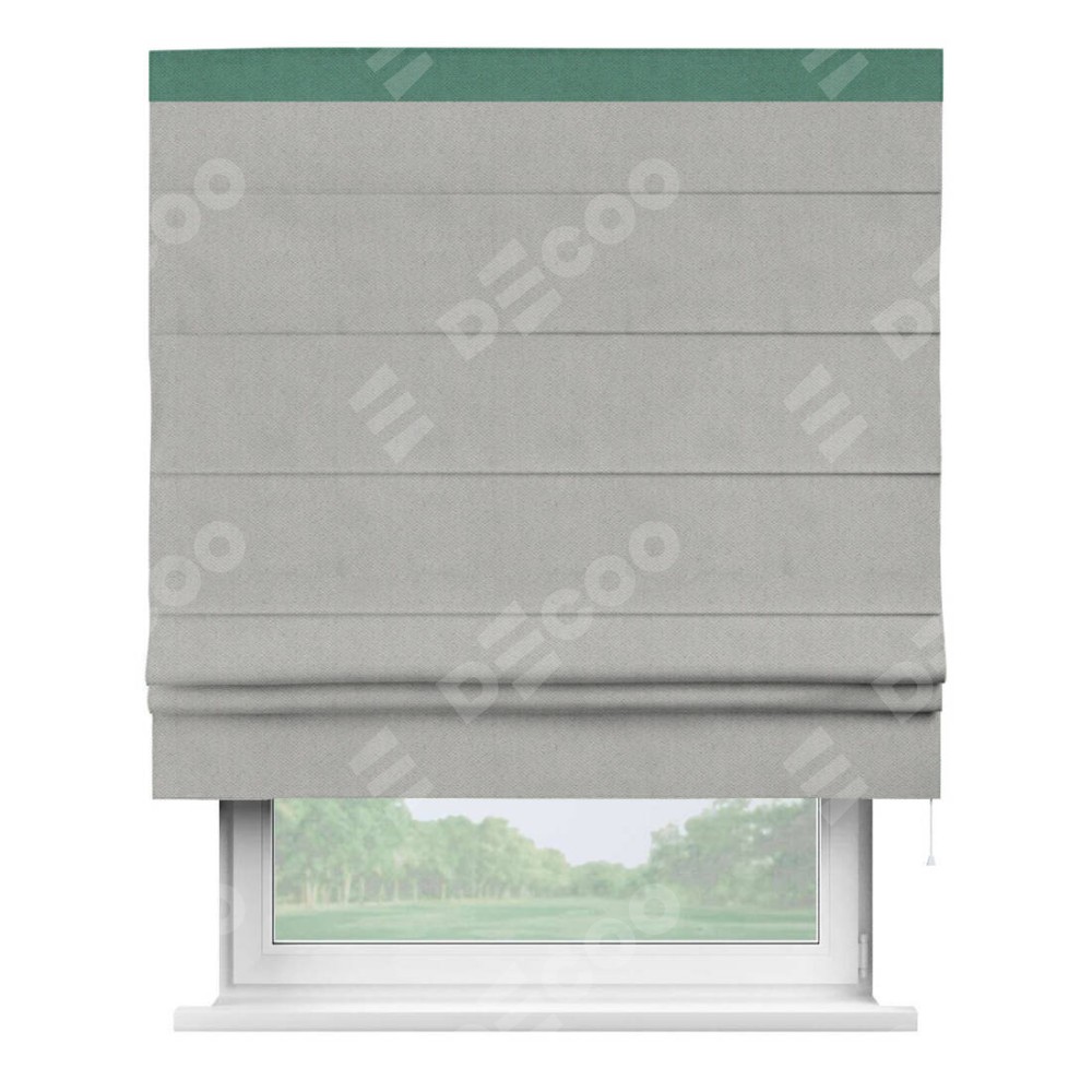 Римская штора производителя «Cortin», используется для проёма, пошита из ткани блэкаут с блеском тёмно-серый, артикул 34634. Отделка шторы кантом «Кинг», ткань для канта используется из блэкаута с блеском разной расцветки на выбор. Изнаночная сторона материала черного цвета, что обеспечивает необходимую светонепроницаемость. Имеет универсальный механизм и подходит для монтажа: на потолок, на стену и в нишу.