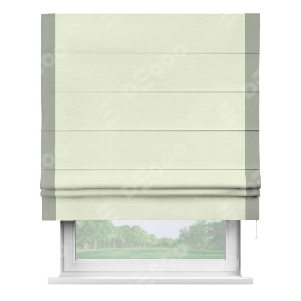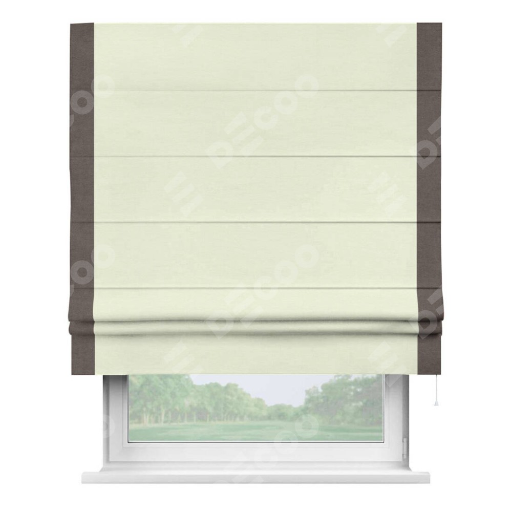 Римская штора производителя «Cortin», используется для проёма, пошита из ткани вельвет молочный, артикул ткани 85536. Отделка шторы кантом «Стрим Дуо», ткань для канта используется из вельвета разной расцветки на выбор. Имеет универсальный механизм и подходит для монтажа: на потолок, на стену и в нишу.