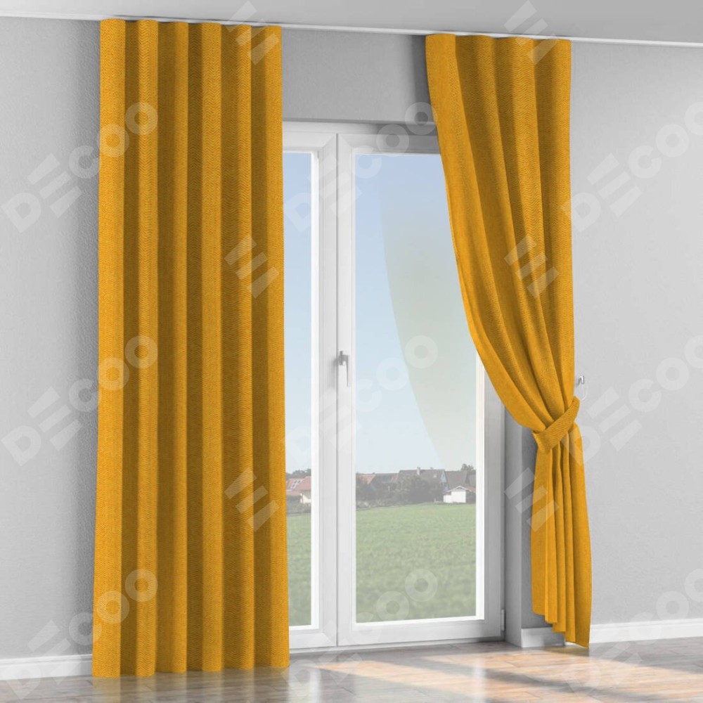 Комплект прямых штор, от производителя «Cortin», пошиты из ткани твид блэкаут медово-желтый, артикул ткани 21641. С изнаночной стороны в верхней части штор пристрачивается шторная лента с декоративными складками «Волна». Для создания элегантных складок прямые шторы шьются по стандарту с коэффициентом 1:2 (на 100 см. ширины проёма 200 см. ширины ткани).