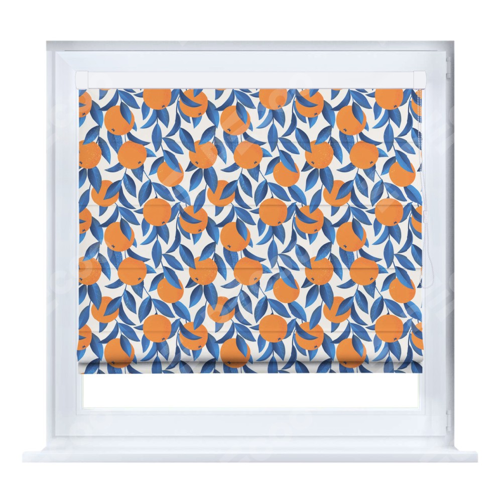 Римская штора производителя «Cortin», устанавливается на створку окна, пошита из ткани блэкаут с нанесением сублимационной печати «Апельсиновое настроение». Штора шьётся по индивидуальным размерам, для данного типа римской шторы возможная ширина от 35 до 150 см., высота до 250 см.