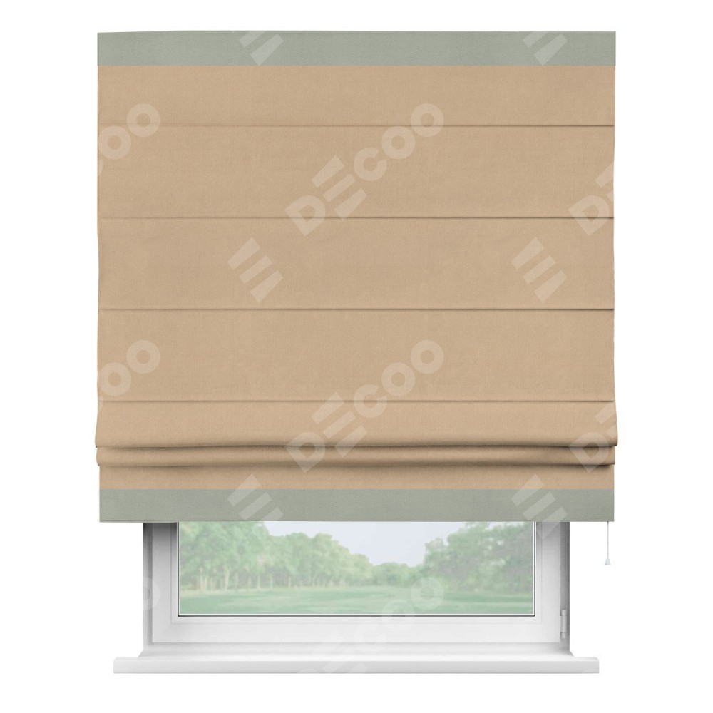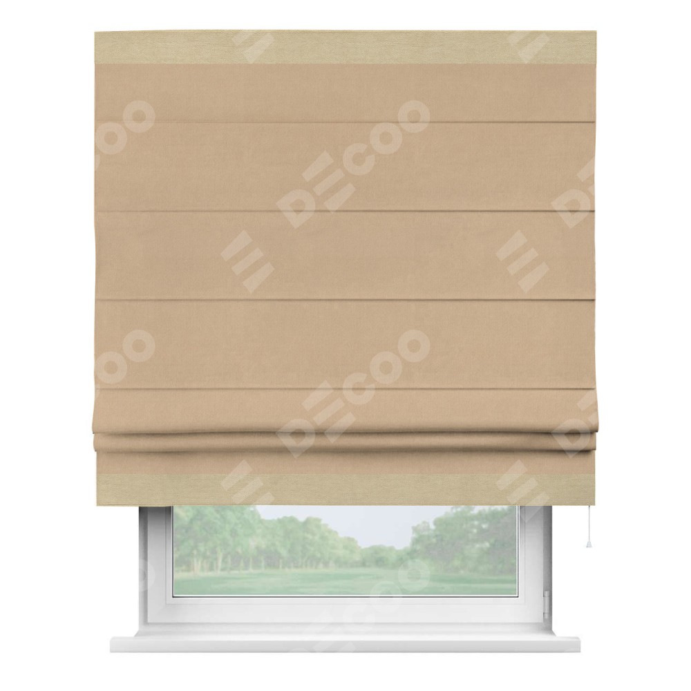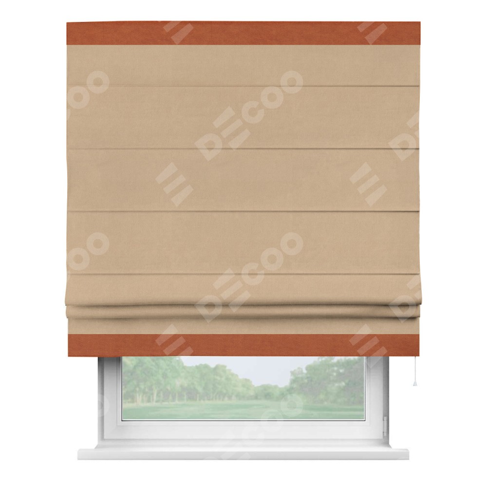 Римская штора производителя «Cortin», используется для проёма, пошита из ткани вельвет песочный, артикул ткани 17740. Отделка шторы кантом «Горизонт», ткань для канта используется из вельвета разной расцветки на выбор. Имеет универсальный механизм и подходит для монтажа: на потолок, на стену и в нишу.