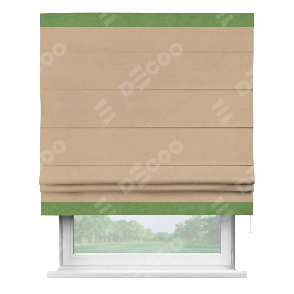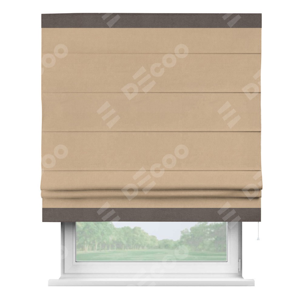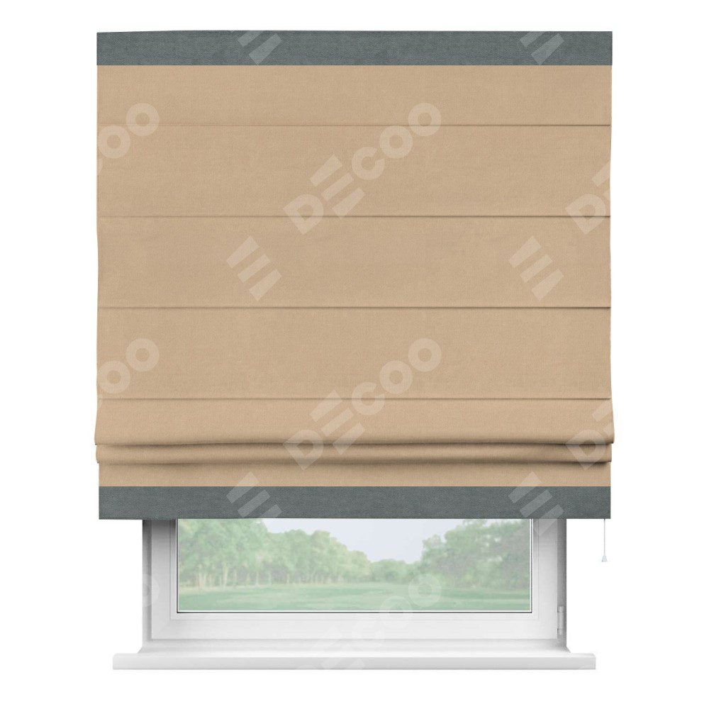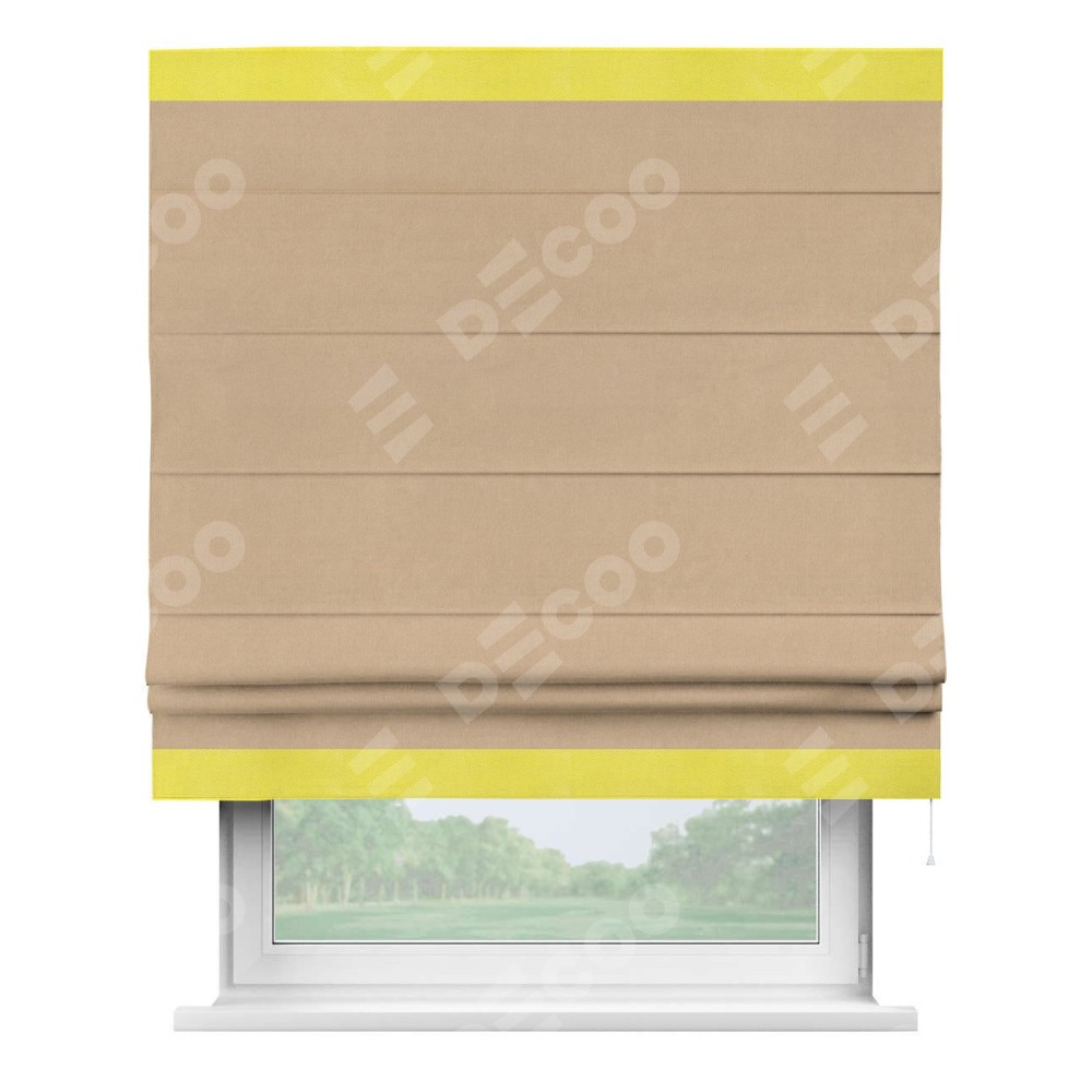 Римская штора производителя «Cortin», используется для проёма, пошита из ткани вельвет песочный, артикул ткани 17740. Отделка шторы кантом «Горизонт», ткань для канта используется из вельвета разной расцветки на выбор. Имеет универсальный механизм и подходит для монтажа: на потолок, на стену и в нишу.