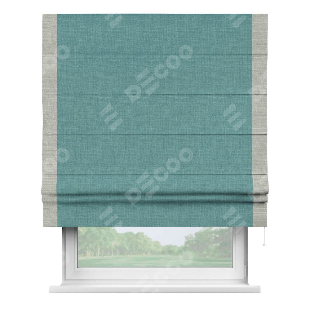 Римская штора производителя «Cortin», используется для проёма, пошита из ткани лён бирюза, артикул 7446. Отделка шторы кантом «Стрим Дуо», ткань для канта используется из льна разной расцветки на выбор. Имеет универсальный механизм и подходит для монтажа: на потолок, на стену и в нишу.