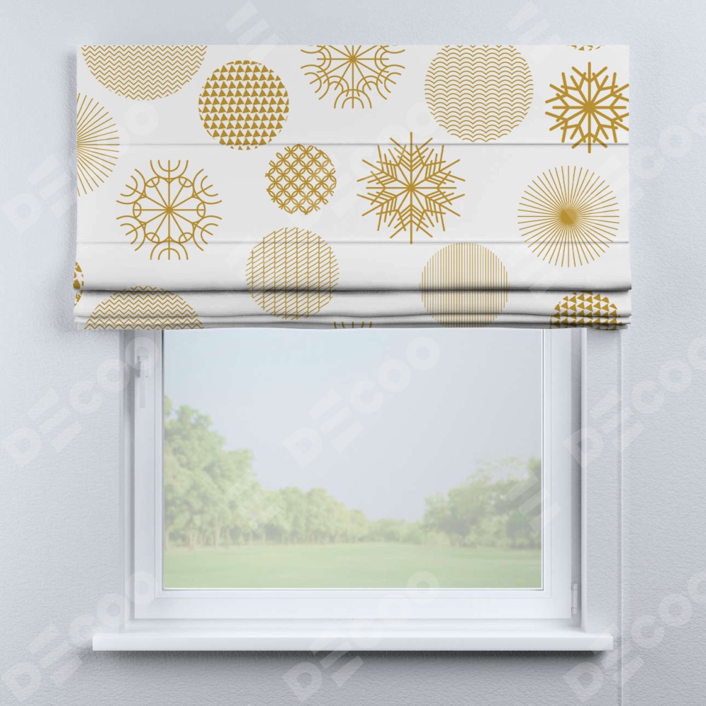 Римская штора производителя «Cortin», используется для проёма, пошита из ткани блэкаут с нанесением сублимационной печати «Золотые шары». Имеет универсальный механизм и подходит для монтажа: на потолок, на стену и в нишу.