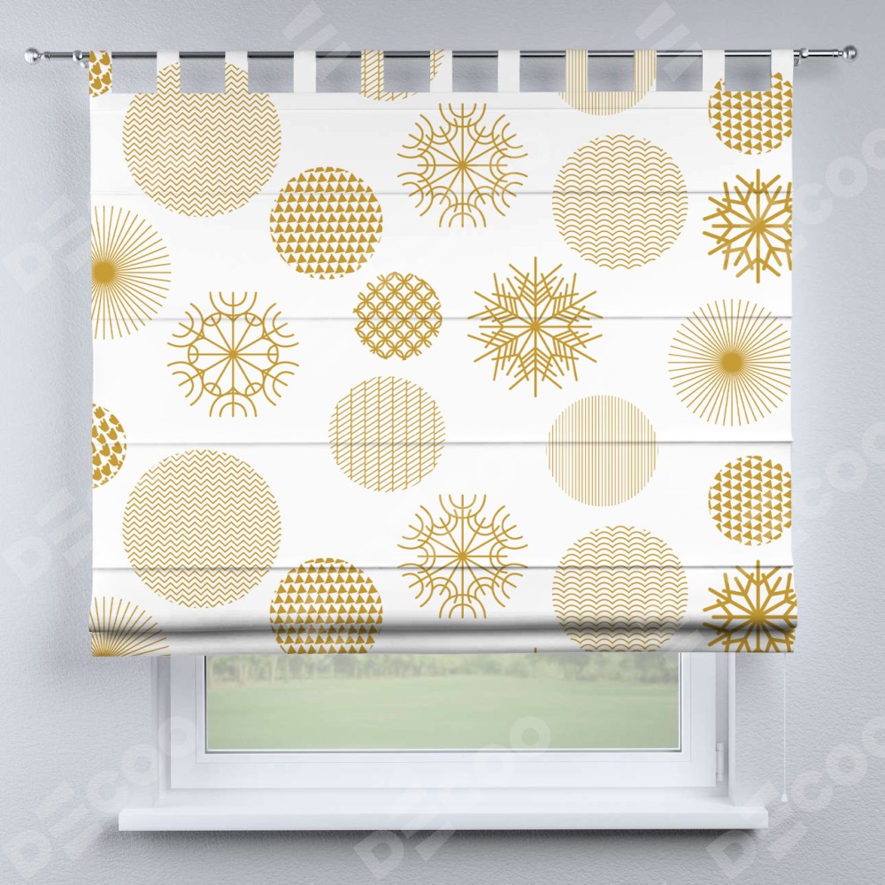 Римская штора производителя «Cortin», используется для проёма, пошита из ткани блэкаут с нанесением сублимационной печати «Золотые шары». Данная модель пошита на петлях, комплектуется на выбор круглым карнизом и подходит для монтажа на стену. Римская штора на петлях имеет простую систему регулировки высоты, отличительным преимуществом данной модели является простой способ монтажа. Достаточно повесить ее на трубу и штора готова!