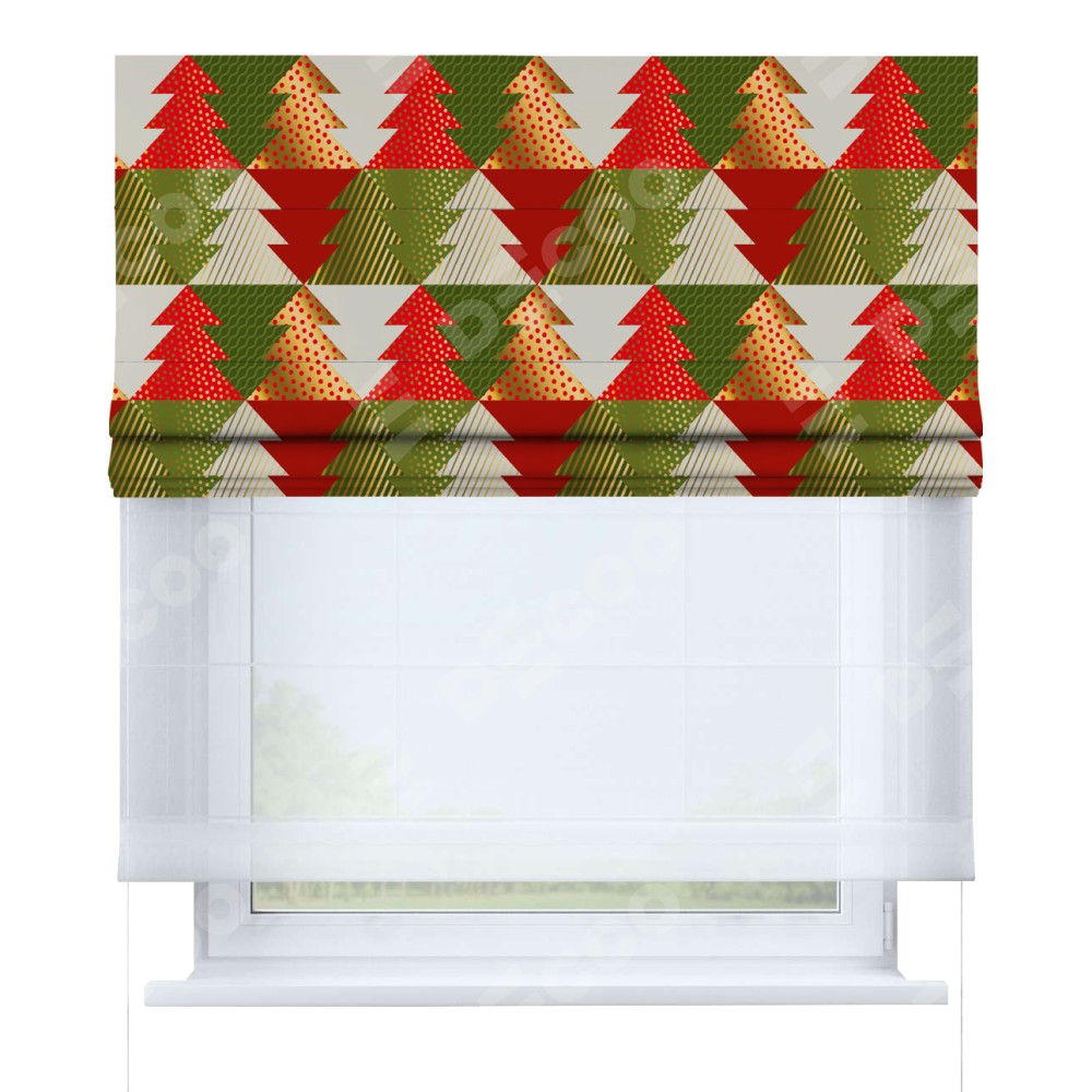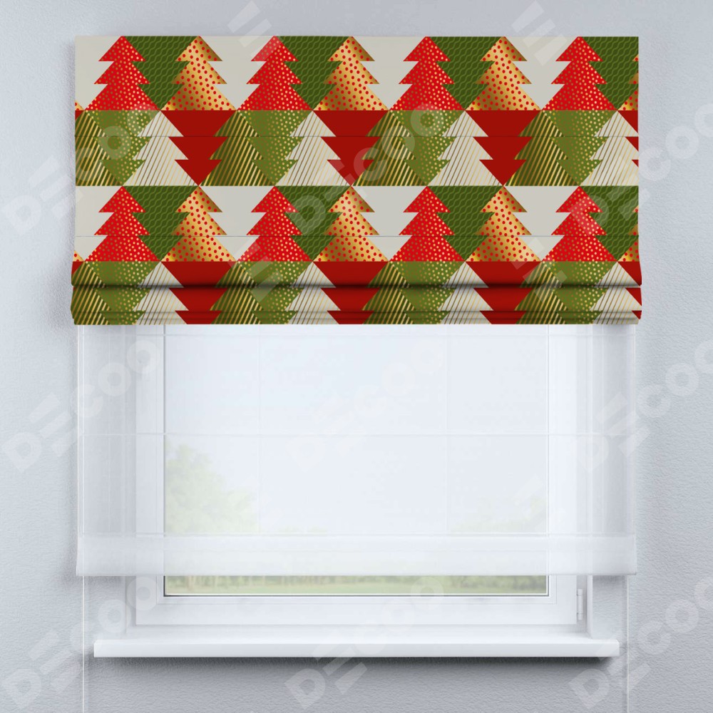 Римская штора день-ночь производителя «Cortin», используется для проёма, пошита из двух полотен, с лицевой блэкаут с нанесением сублимационной печати «Новогоднее украшение», вторая ткань тюль (по стандарту комплектуется тюль белого цвета артикул V-01). Имеет универсальный механизм и подходит для монтажа: на потолок, на стену и в нишу.