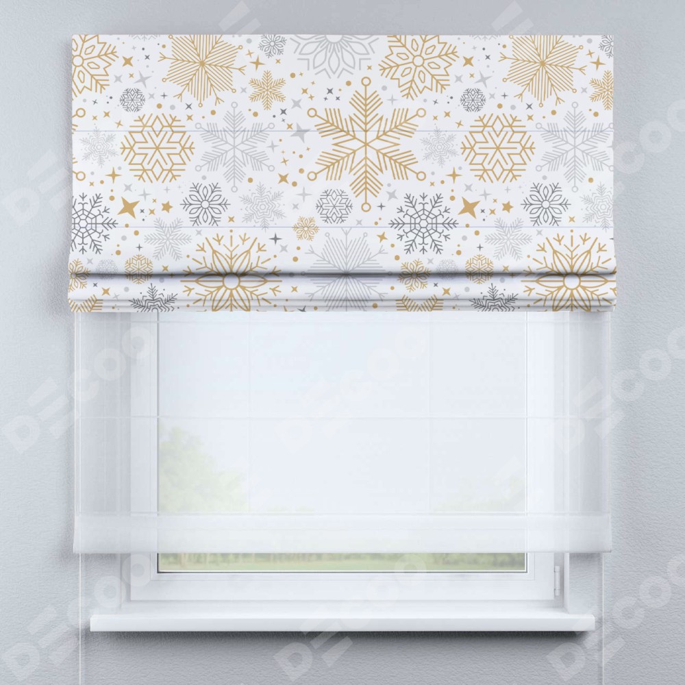 Римская штора день-ночь производителя «Cortin», используется для проёма, пошита из двух полотен, с лицевой блэкаут с нанесением сублимационной печати «Снежное очарование», вторая ткань тюль (по стандарту комплектуется тюль белого цвета артикул V-01). Имеет универсальный механизм и подходит для монтажа: на потолок, на стену и в нишу.