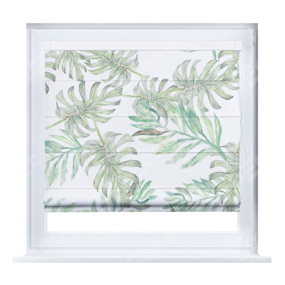 Римская штора производителя «Cortin», устанавливается на створку окна, пошита из ткани блэкаут с нанесением сублимационной печати «Листья монстеры». Штора шьётся по индивидуальным размерам, для данного типа римской шторы возможная ширина от 35 до 150 см., высота до 250 см.