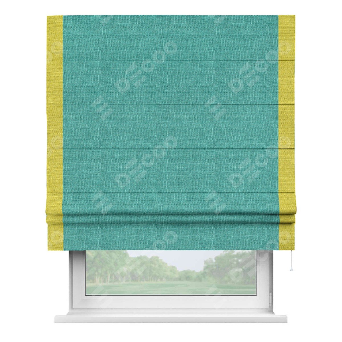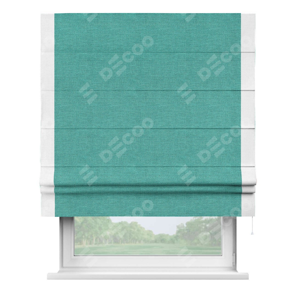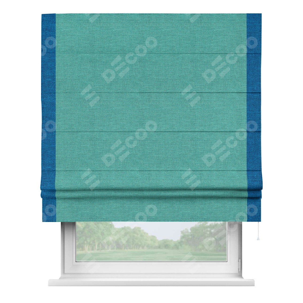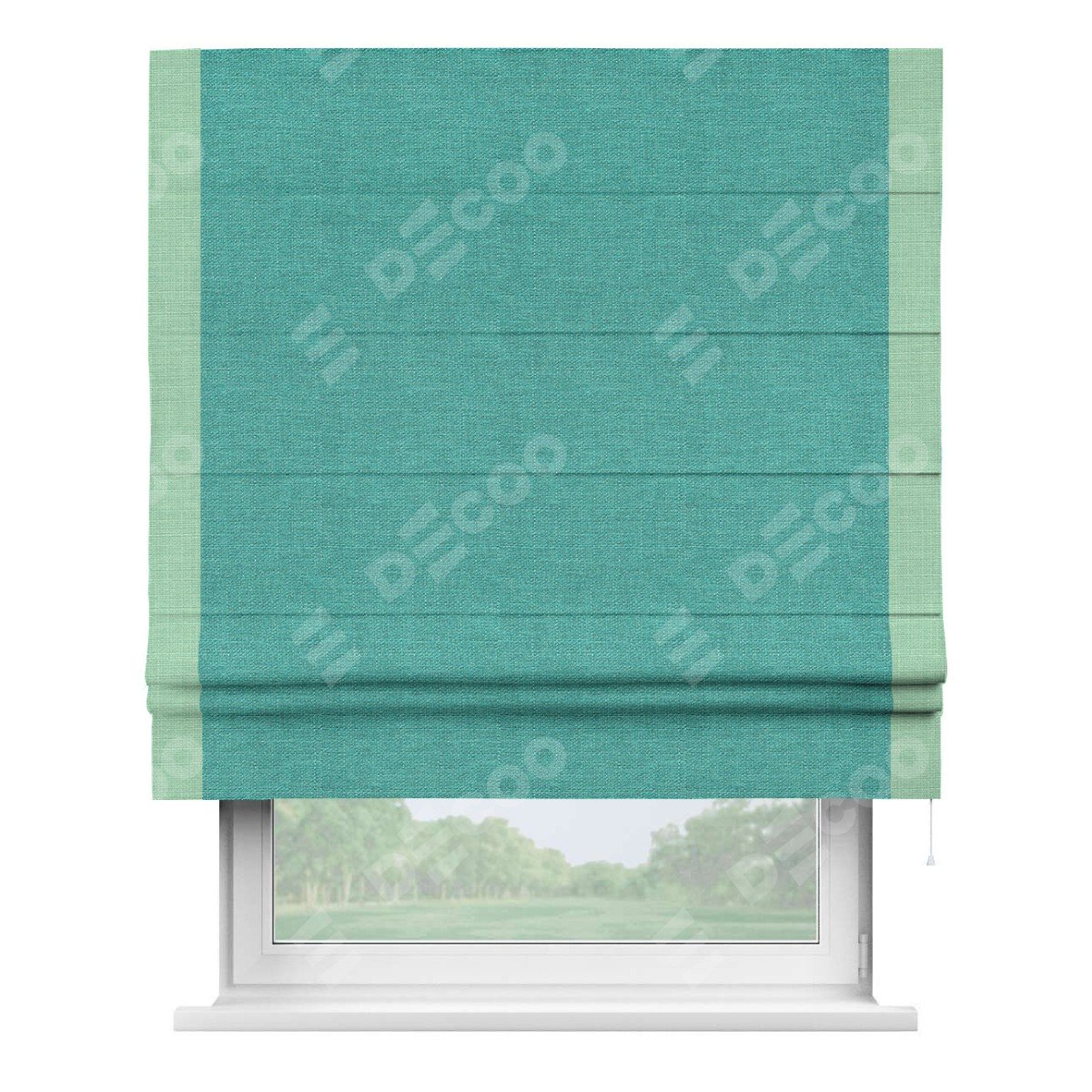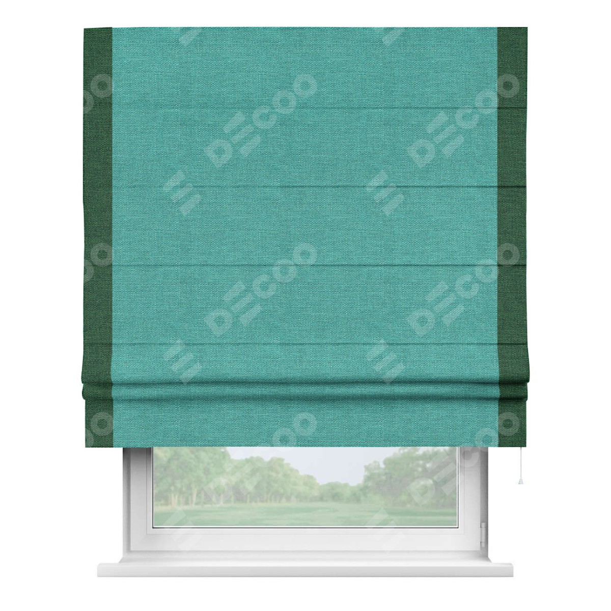 Римская штора производителя «Cortin», используется для проёма, пошита из ткани лён изумрудный, артикул 85908. Отделка шторы кантом «Стрим Дуо», ткань для канта используется из льна разной расцветки на выбор. Имеет универсальный механизм и подходит для монтажа: на потолок, на стену и в нишу.