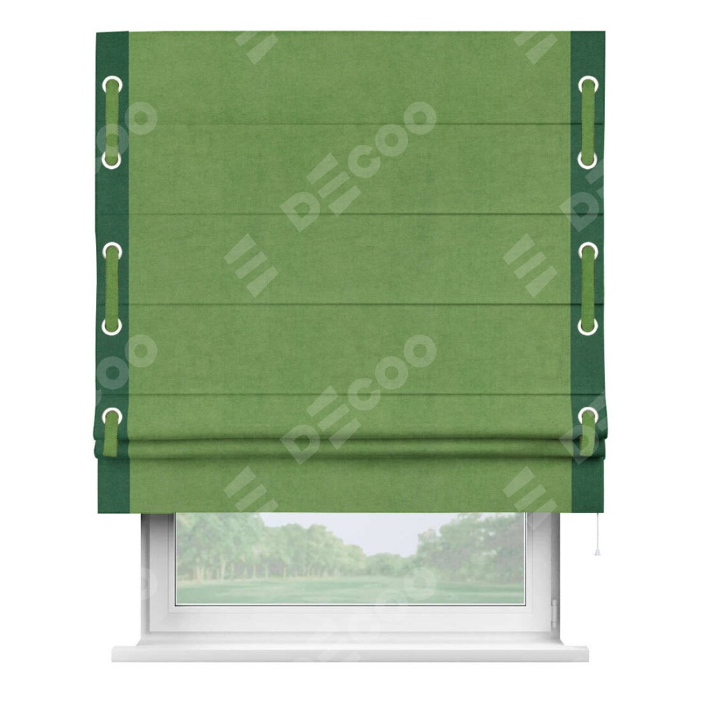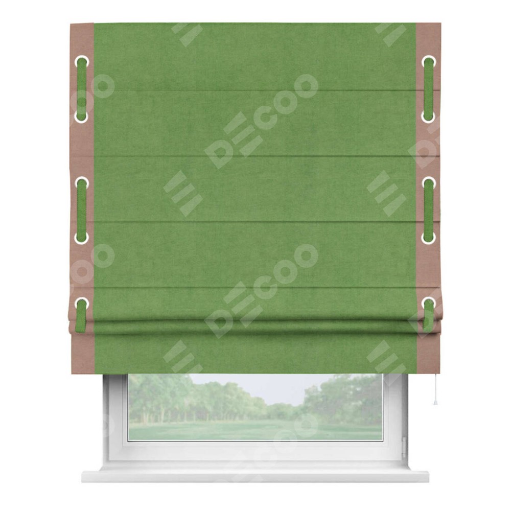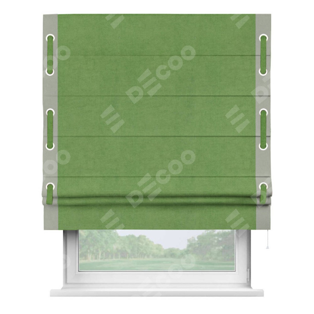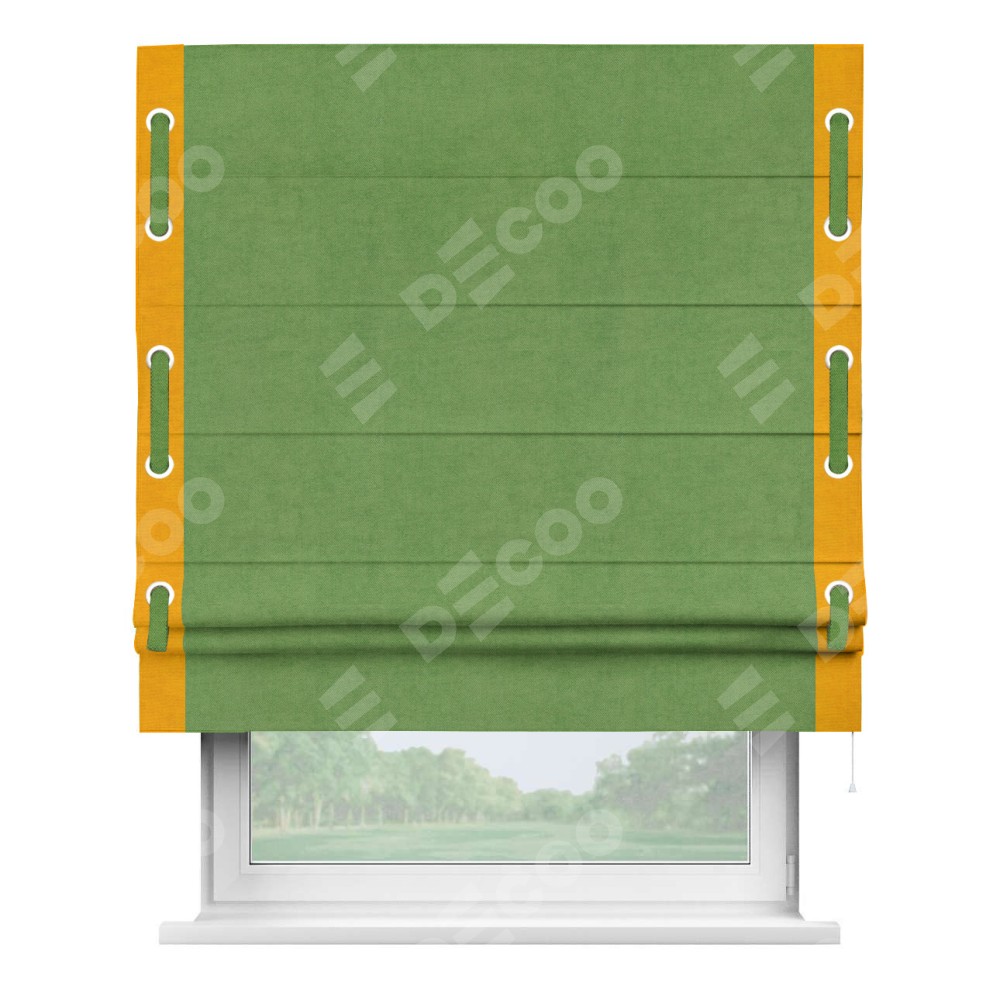 Римская штора производителя «Cortin», используется для проёма, пошита из ткани вельвет салатовый, артикул ткани 87072. Отделка шторы кантом «Стрим Дуо» на кантах расположены люверсы с пояском, ткань для канта используется из вельвета разной расцветки на выбор. Ткань для пояска обычно используется из основной ткани шторы, а так же можно сделать из любой расцветки по желанию. Имеет универсальный механизм и подходит для монтажа: на потолок, на стену и в нишу.