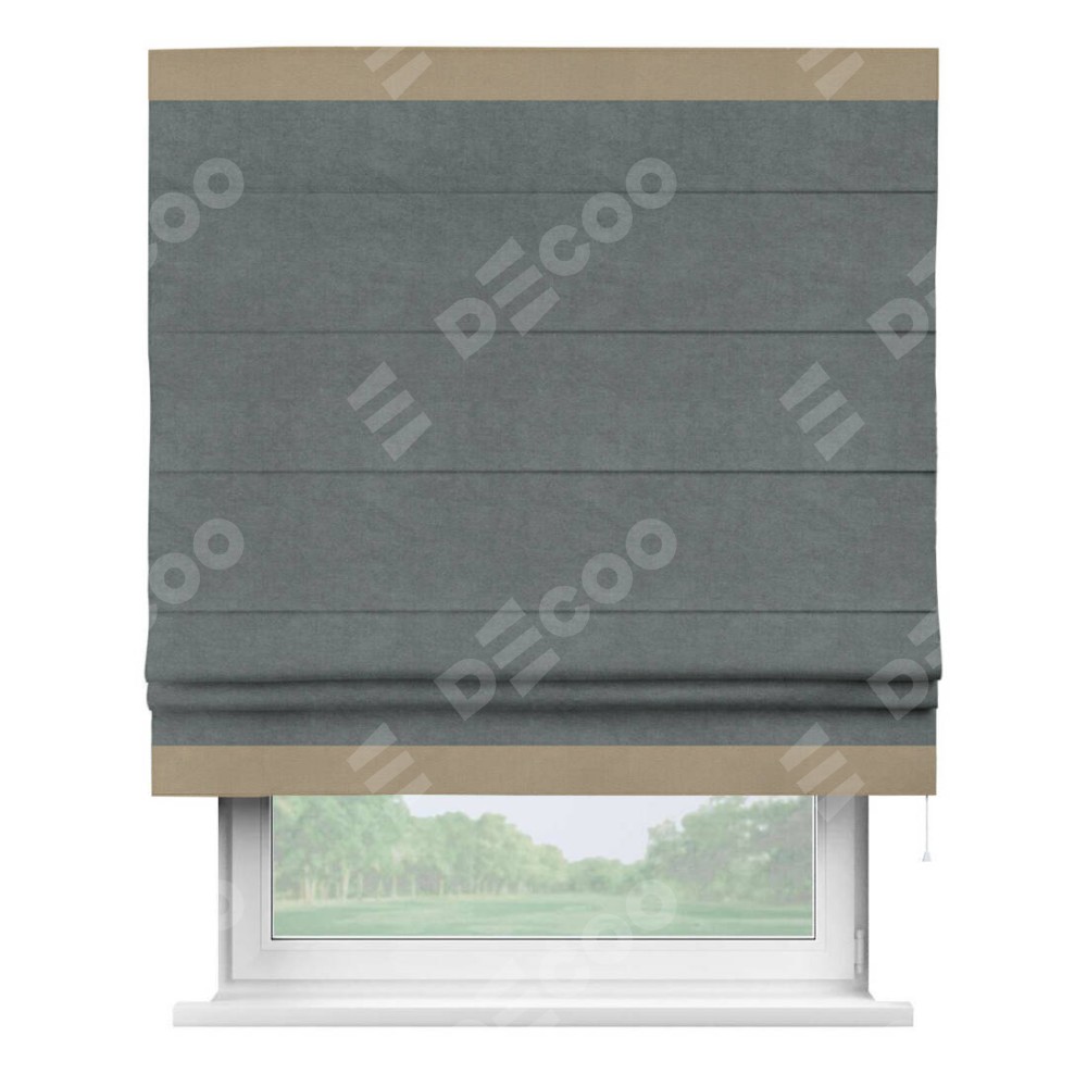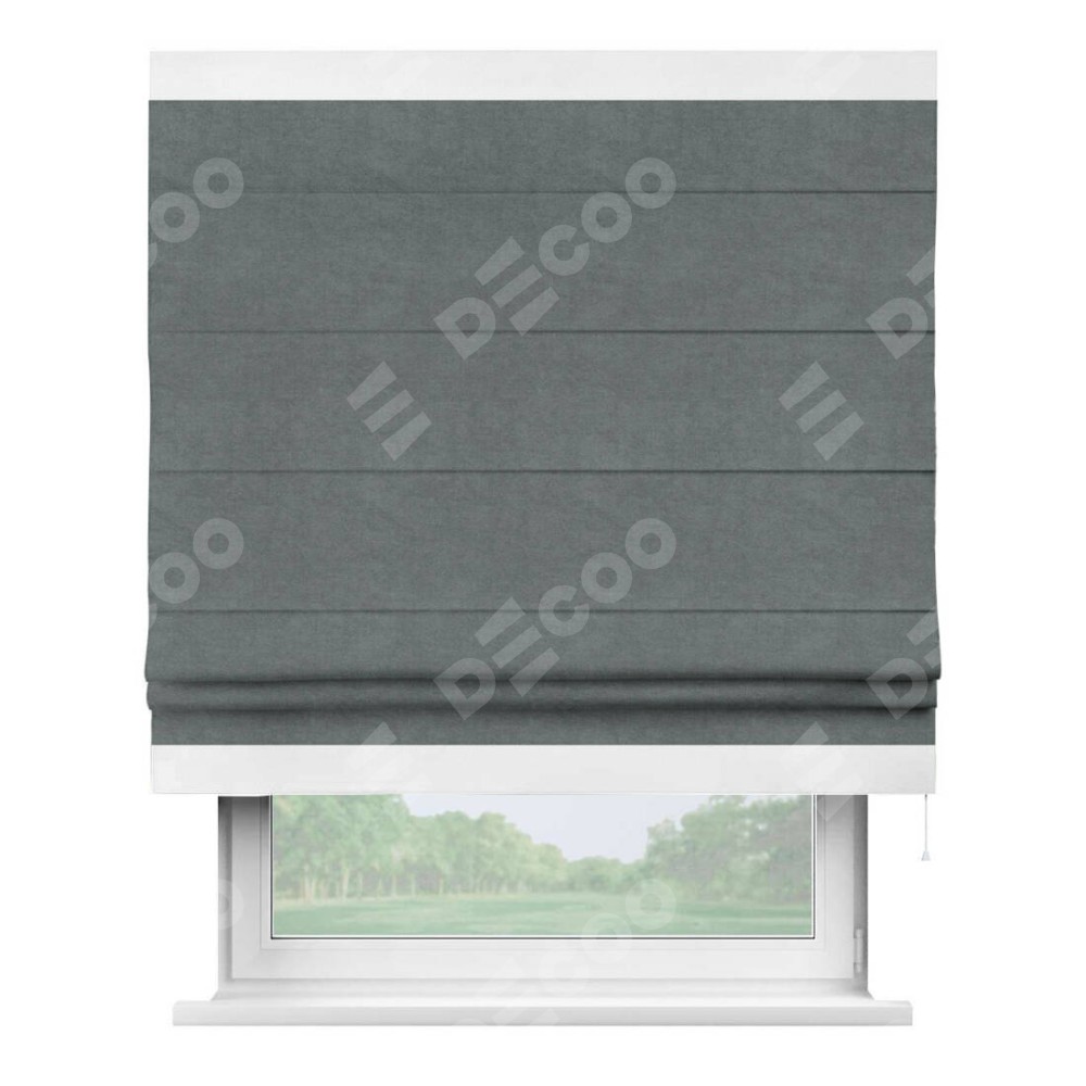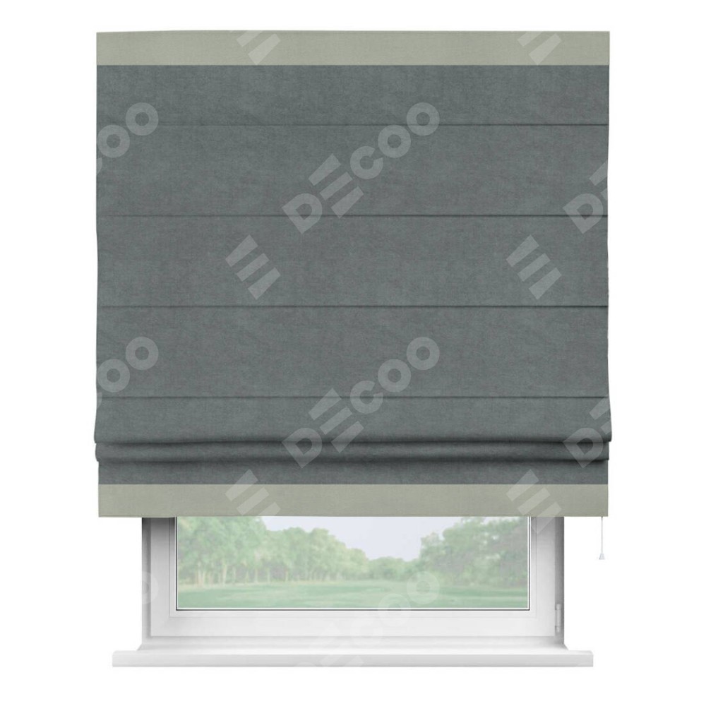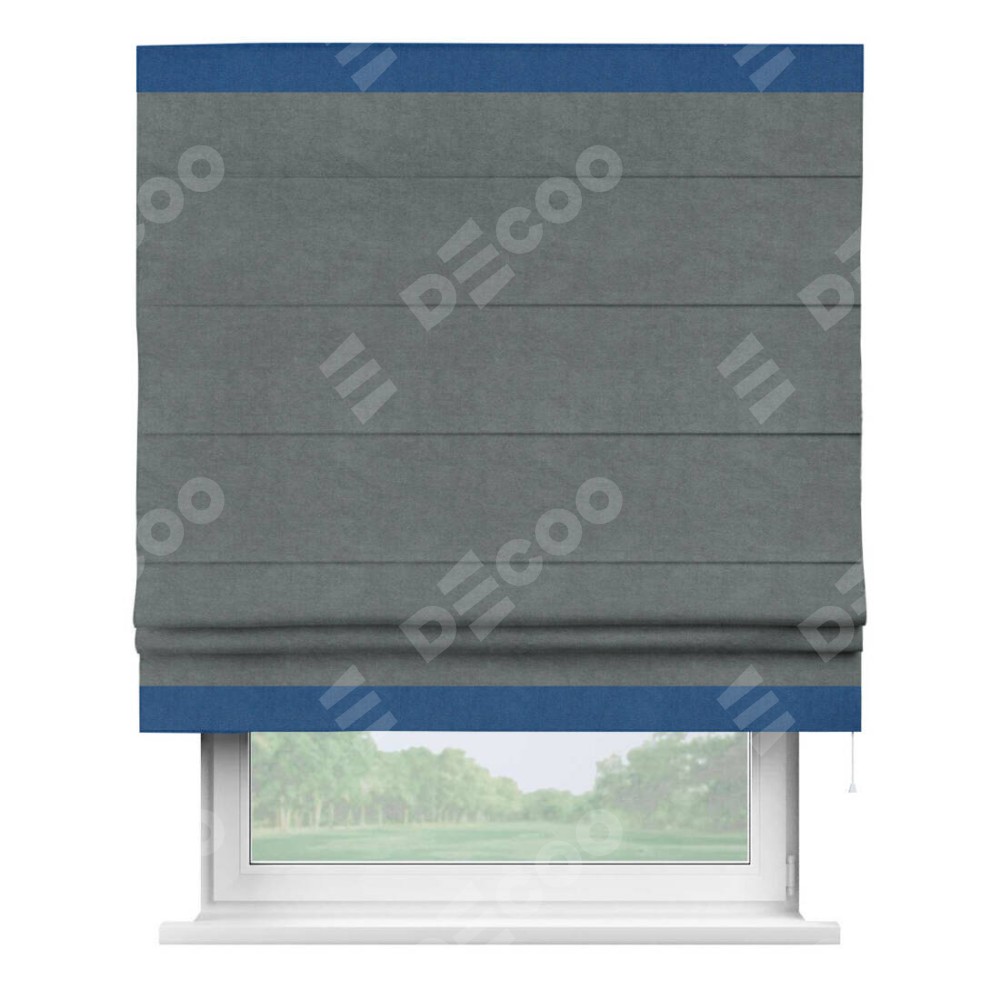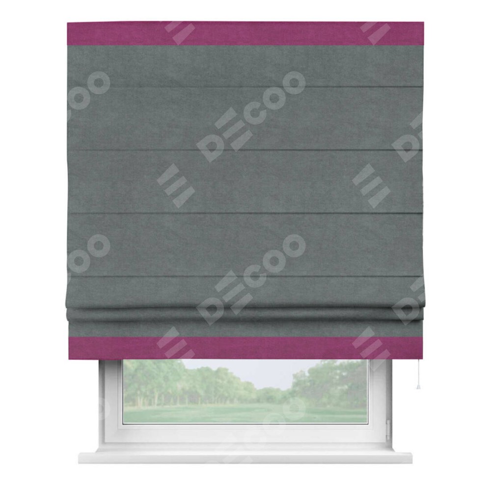 Римская штора производителя «Cortin», используется для проёма, пошита из ткани вельвет серый, артикул ткани 85542. Отделка шторы кантом «Горизонт», ткань для канта используется из вельвета разной расцветки на выбор. Имеет универсальный механизм и подходит для монтажа: на потолок, на стену и в нишу.
