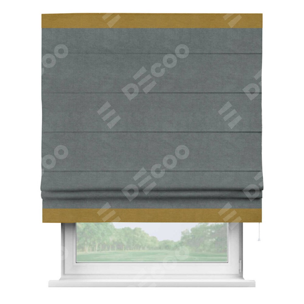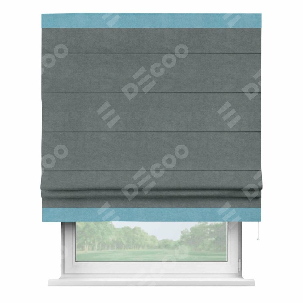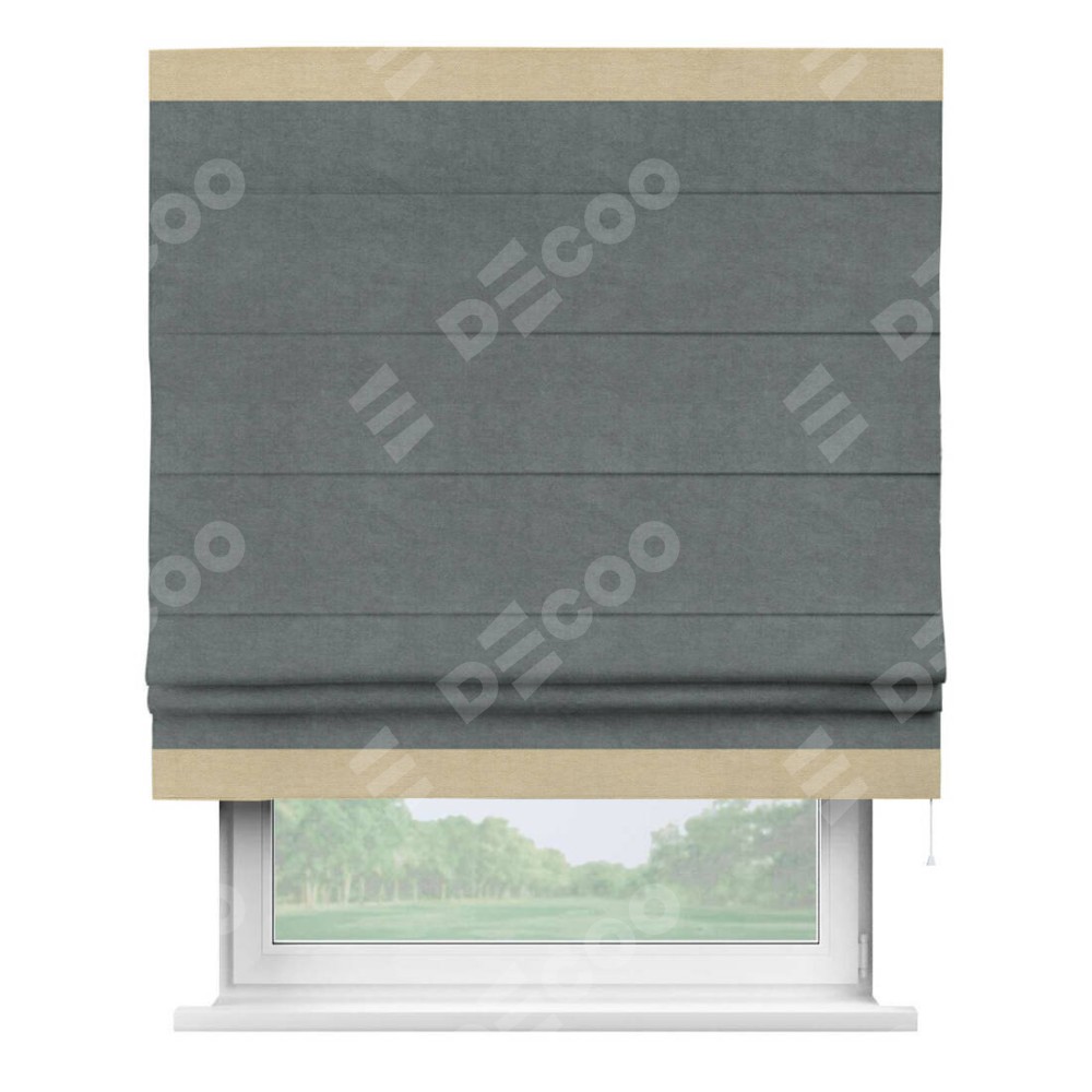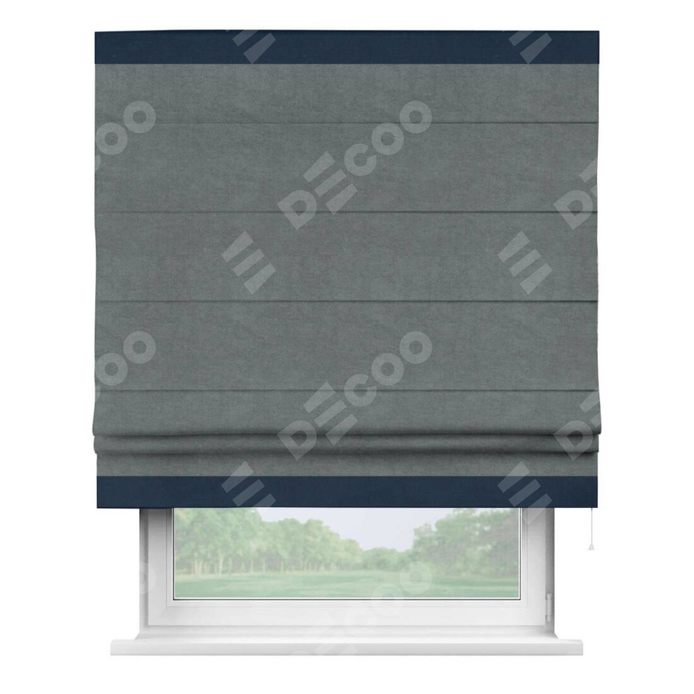 Римская штора производителя «Cortin», используется для проёма, пошита из ткани вельвет серый, артикул ткани 85542. Отделка шторы кантом «Горизонт», ткань для канта используется из вельвета разной расцветки на выбор. Имеет универсальный механизм и подходит для монтажа: на потолок, на стену и в нишу.