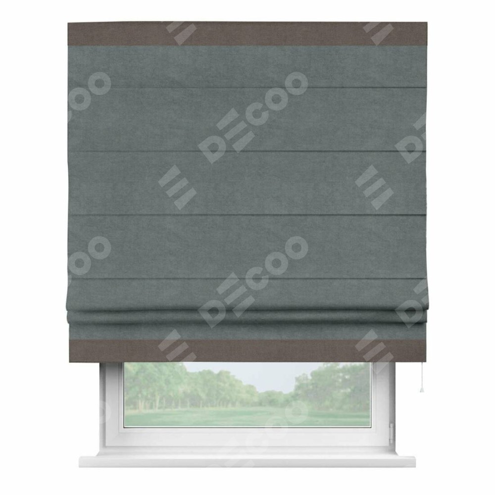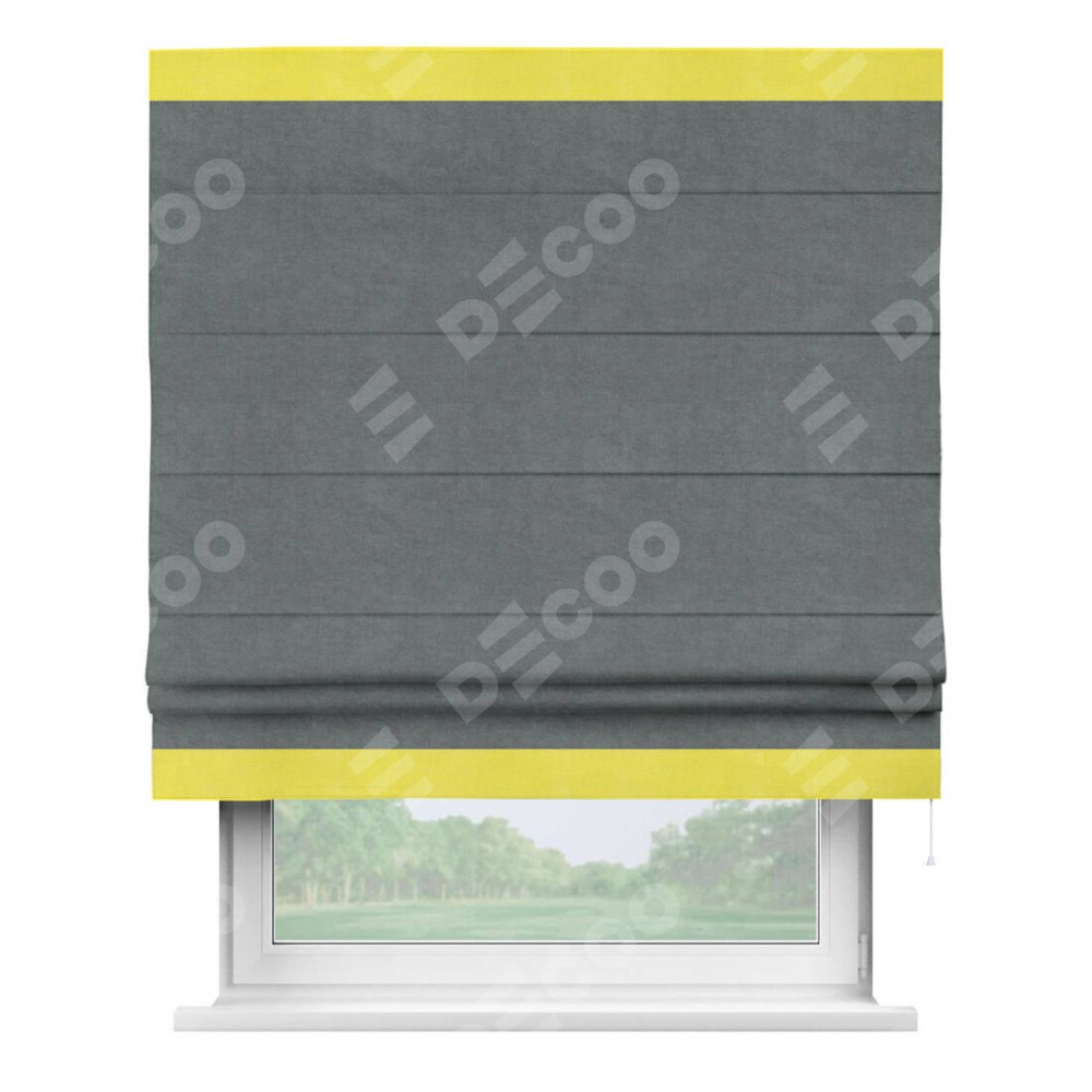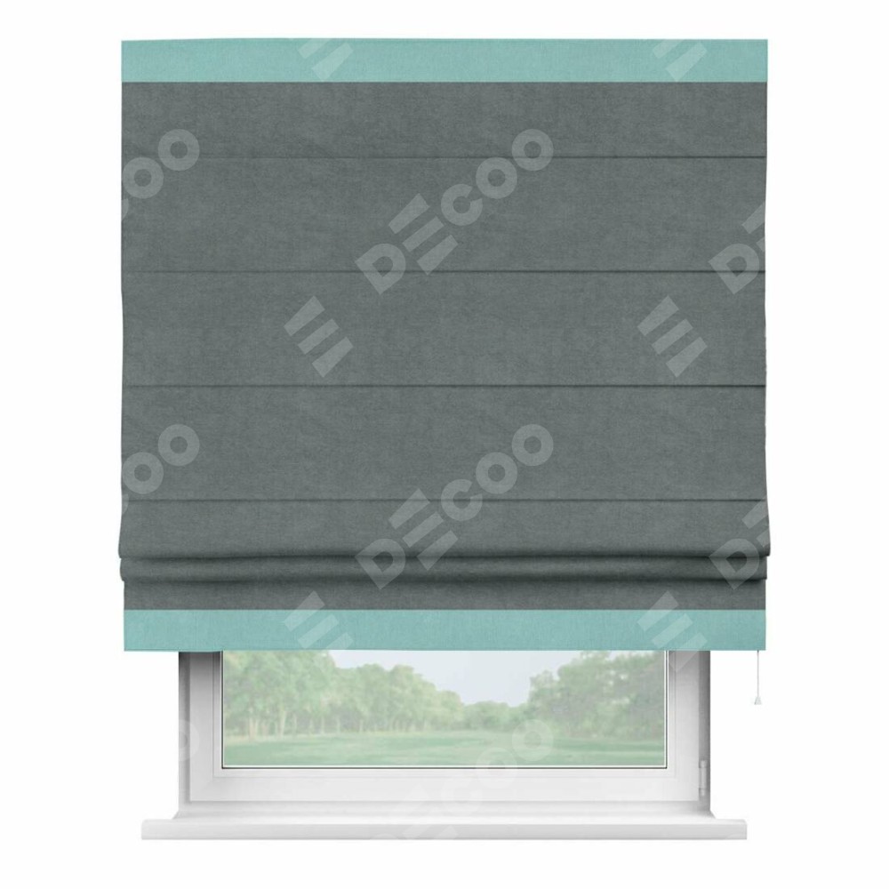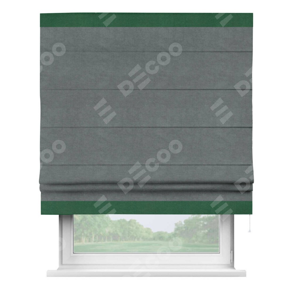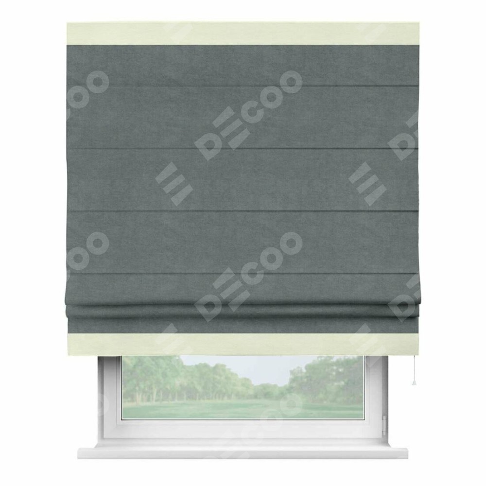 Римская штора производителя «Cortin», используется для проёма, пошита из ткани вельвет серый, артикул ткани 85542. Отделка шторы кантом «Горизонт», ткань для канта используется из вельвета разной расцветки на выбор. Имеет универсальный механизм и подходит для монтажа: на потолок, на стену и в нишу.
