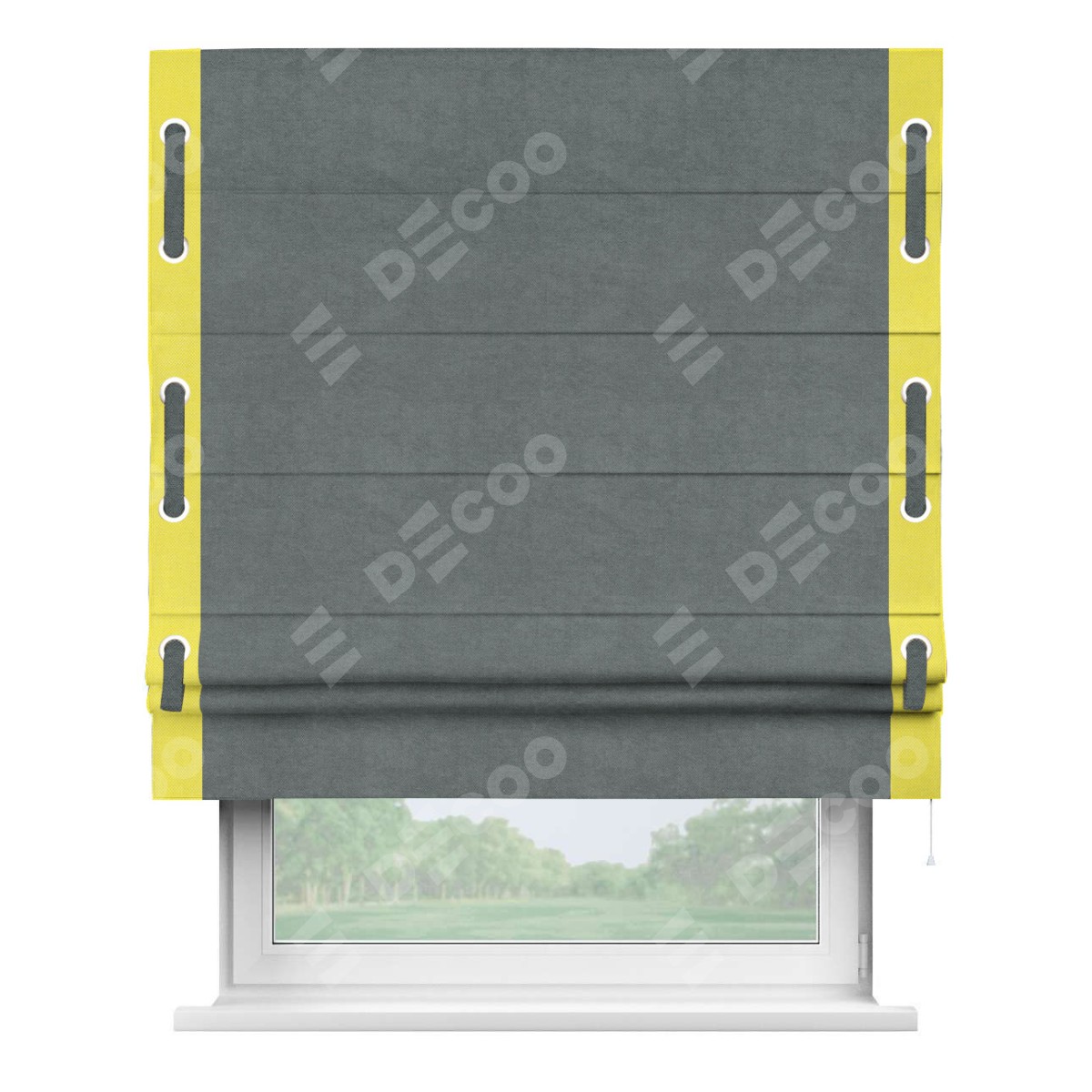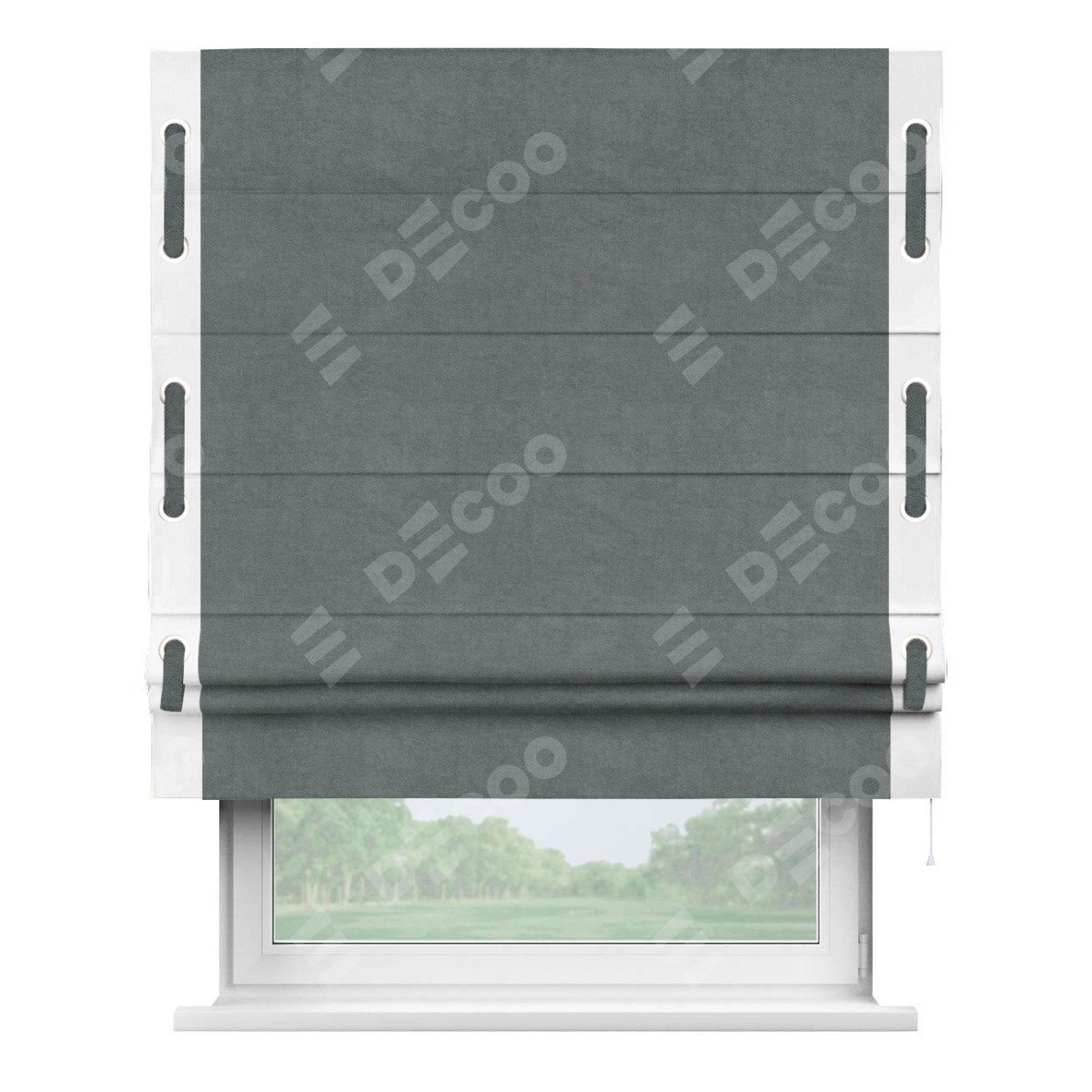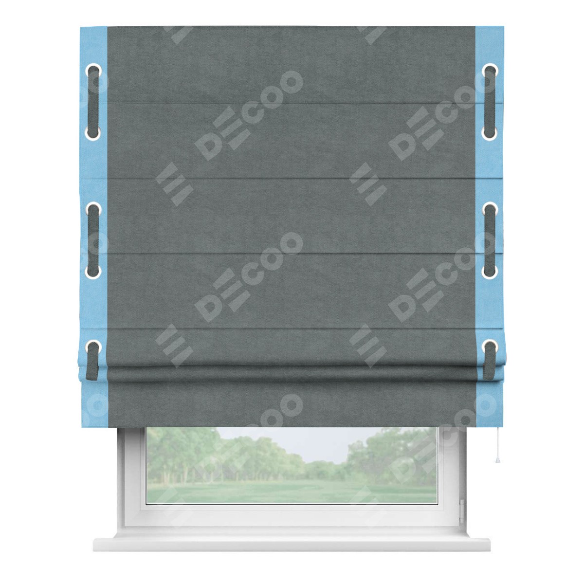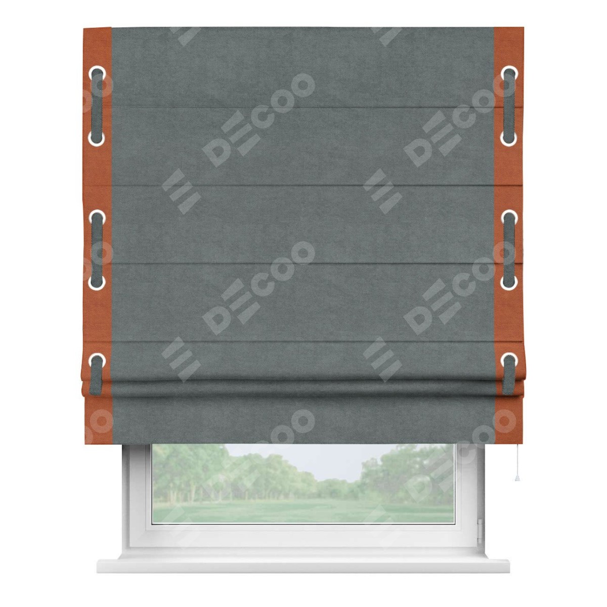 Римская штора производителя «Cortin», используется для проёма, пошита из ткани вельвет серый, артикул ткани 85542. Отделка шторы кантом «Стрим Дуо» на кантах расположены люверсы с пояском, ткань для канта используется из вельвета разной расцветки на выбор. Ткань для пояска обычно используется из основной ткани шторы, а так же можно сделать из любой расцветки по желанию. Имеет универсальный механизм и подходит для монтажа: на потолок, на стену и в нишу.