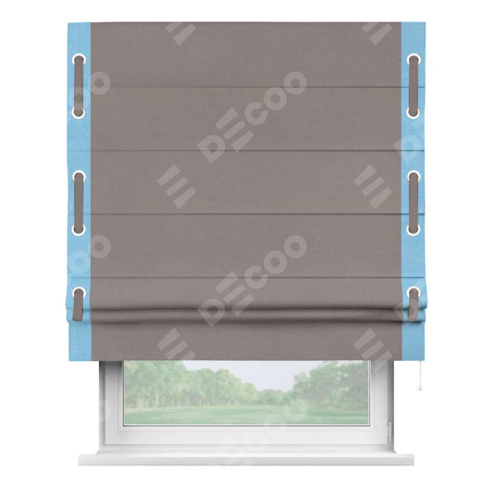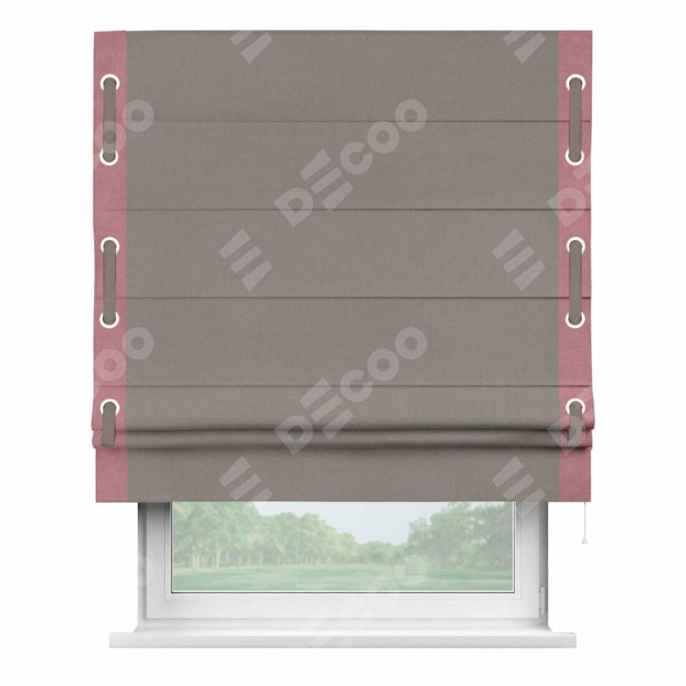 Римская штора производителя «Cortin», используется для проёма, пошита из ткани вельвет темно-бежевый, артикул ткани 82527. Отделка шторы кантом «Стрим Дуо» на кантах расположены люверсы с пояском, ткань для канта используется из вельвета разной расцветки на выбор. Ткань для пояска обычно используется из основной ткани шторы, а так же можно сделать из любой расцветки по желанию. Имеет универсальный механизм и подходит для монтажа: на потолок, на стену и в нишу.