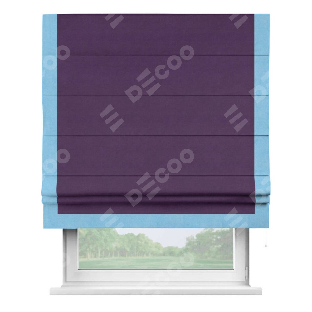 Римская штора производителя «Cortin», используется для проёма, пошита из ткани вельвет темно-фиолетовый, артикул ткани 17753. Отделка шторы кантом «Виктория», ткань для канта используется из вельвета разной расцветки на выбор. Имеет универсальный механизм и подходит для монтажа: на потолок, на стену и в нишу.