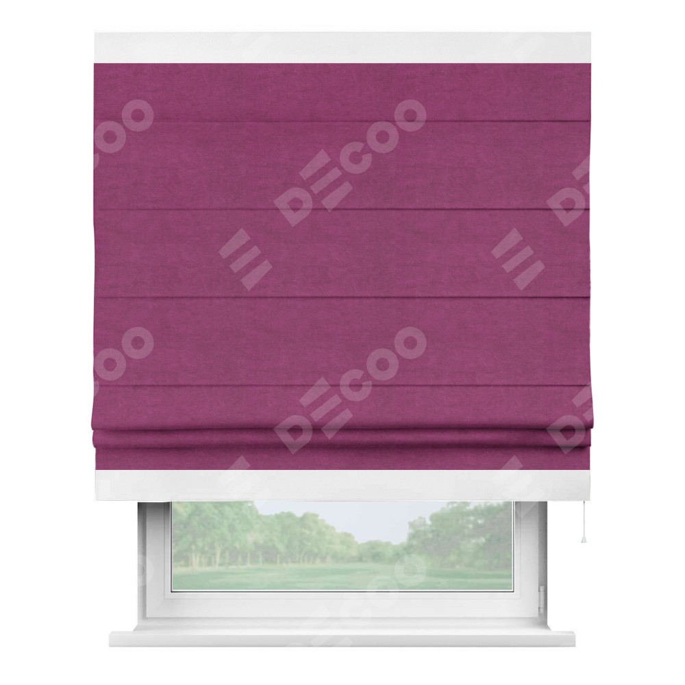 Римская штора производителя «Cortin», используется для проёма, пошита из ткани вельвет фиолетовый, артикул ткани 85552. Отделка шторы кантом «Горизонт», ткань для канта используется из вельвета разной расцветки на выбор. Имеет универсальный механизм и подходит для монтажа: на потолок, на стену и в нишу.
