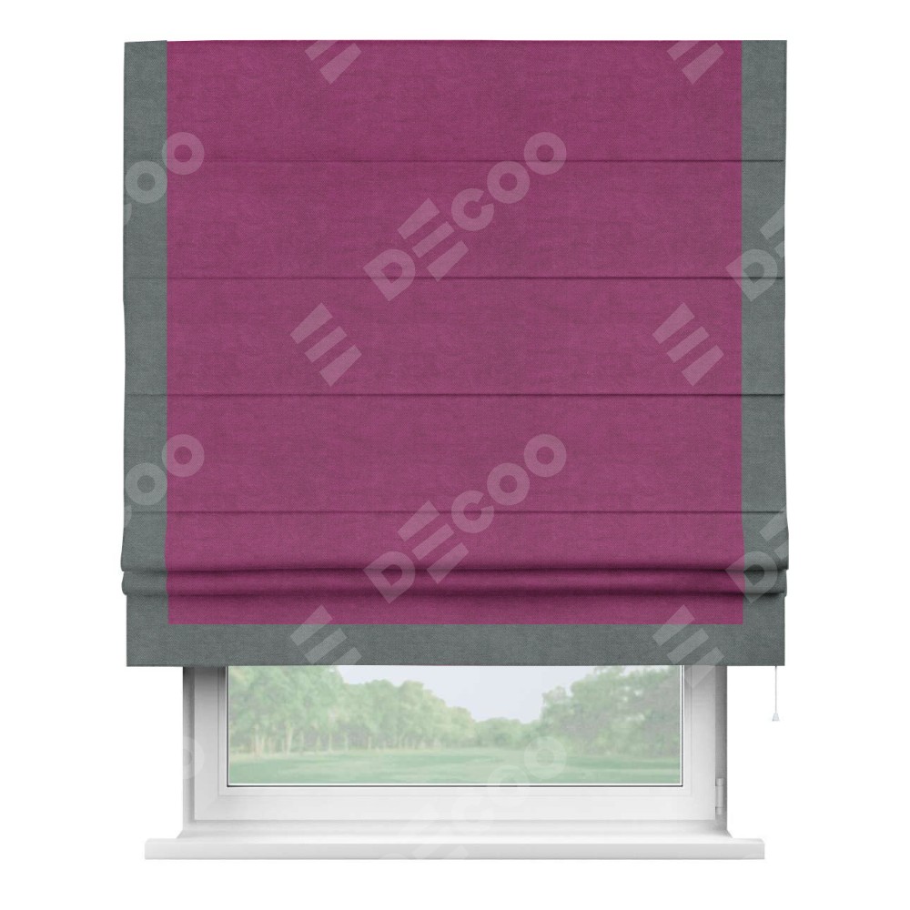 Римская штора производителя «Cortin», используется для проёма, пошита из ткани вельвет фиолетовый, артикул ткани 85552. Отделка шторы кантом «Виктория», ткань для канта используется из вельвета разной расцветки на выбор. Имеет универсальный механизм и подходит для монтажа: на потолок, на стену и в нишу.