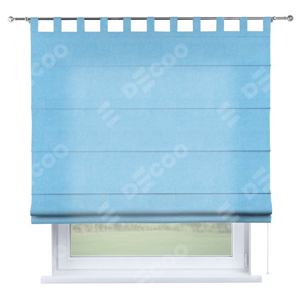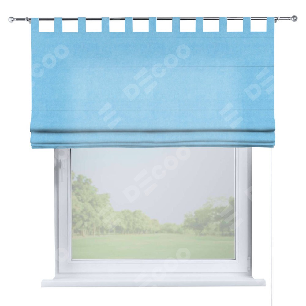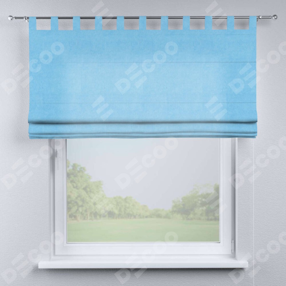 Римская штора производителя «Cortin», используется для проёма, пошита из ткани вельвет голубой, артикул ткани 85544. Данная модель пошита на петлях, комплектуется на выбор круглым карнизом и подходит для монтажа на стену. Римская штора на петлях имеет простую систему регулировки высоты, отличительным преимуществом данной модели является простой способ монтажа. Достаточно повесить ее на трубу и штора готова!