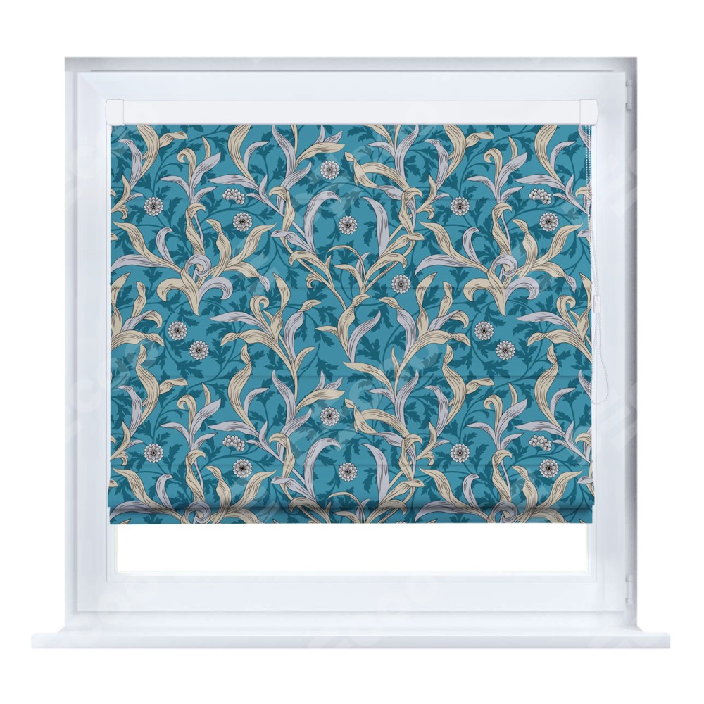 Римская штора кассетного типа, производителя «Cortin», устанавливается только на пластиковые окна и прилегает к стеклопакету, пошита из ткани блэкаут с нанесением сублимационной печати «Винтажные листья».