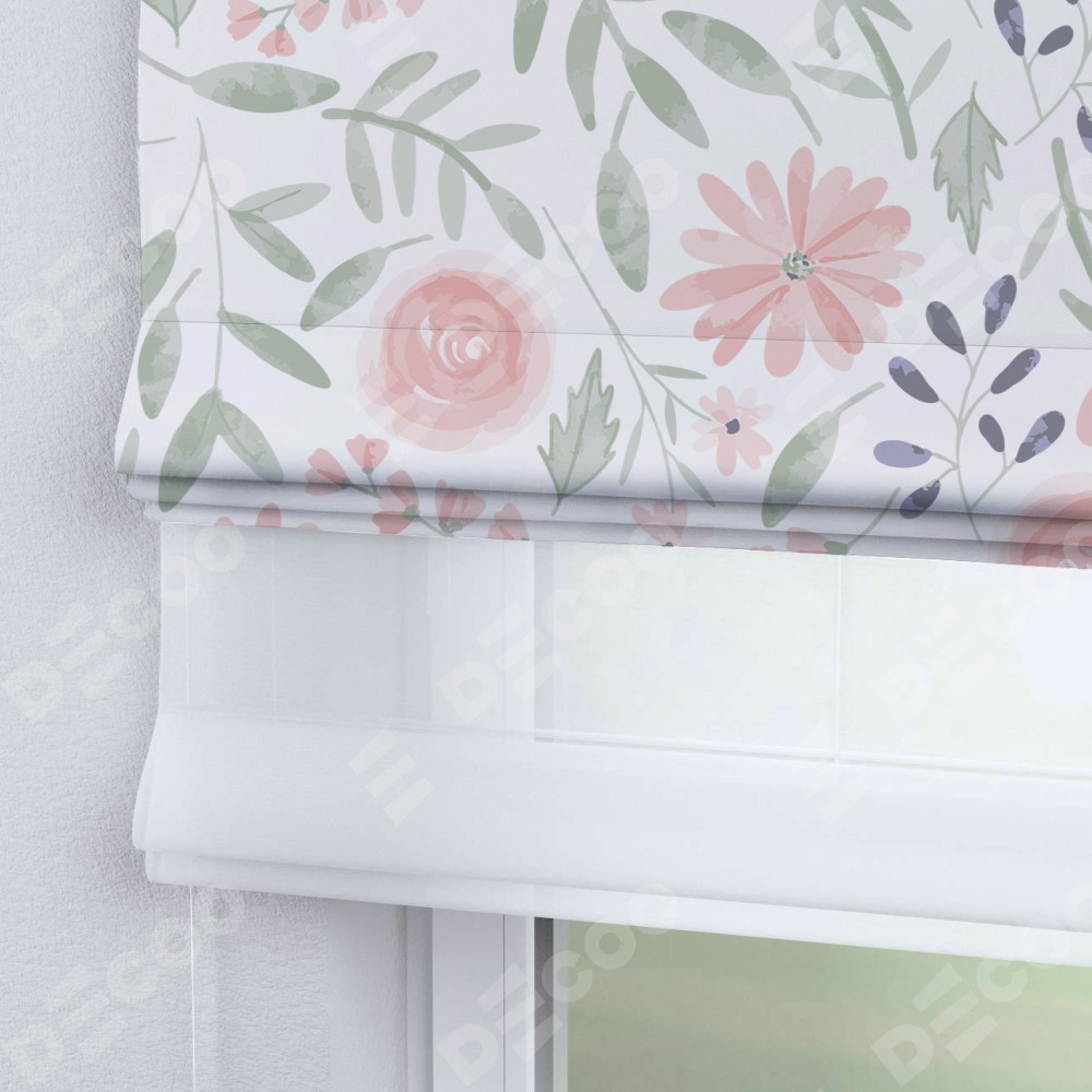 Римская штора день-ночь производителя «Cortin», используется для проёма, пошита из двух полотен, с лицевой блэкаут с нанесением сублимационной печати «Изысканные цветы», вторая ткань тюль (по стандарту комплектуется тюль белого цвета артикул V-01). Имеет универсальный механизм и подходит для монтажа: на потолок, на стену и в нишу.