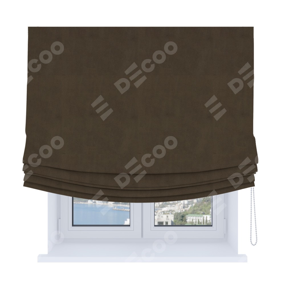 Римская штора Soft производителя «Cortin», используется для проёма, пошита из ткани бархат тёмно-коричневый, артикул ткани 5017. Имеет универсальный механизм и подходит для монтажа: на потолок, на стену и в нишу. В отличие от стандартных римских штор, римская штора Soft не имеет горизонтальных вставок и нижнего отвеса. Это позволяет ткани произвольно драпироваться в свободные мягкие складки.