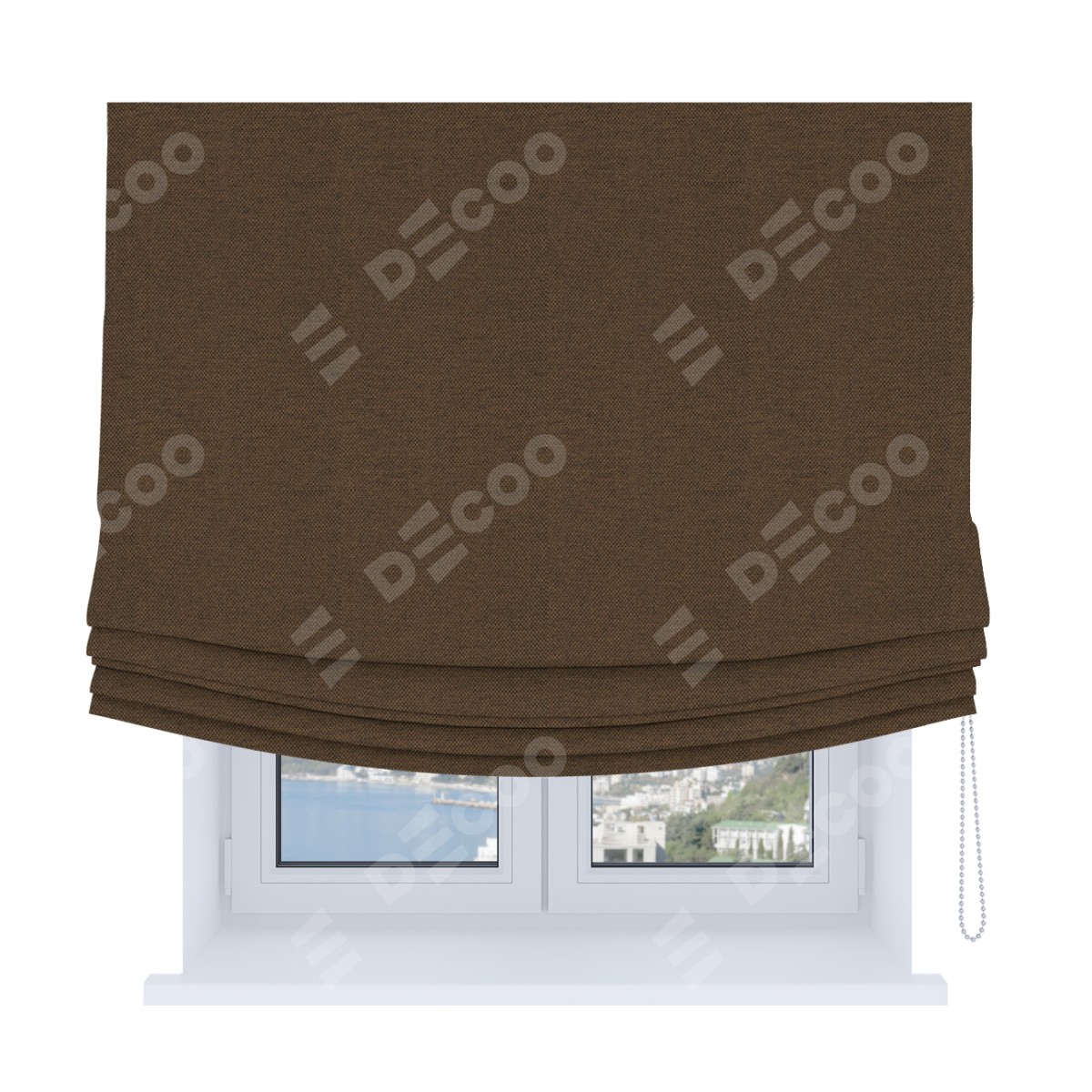 Римская штора Soft производителя «Cortin», используется для проёма, пошита из ткани лён димаут тёмно-коричневый, артикул ткани 83030. Имеет универсальный механизм и подходит для монтажа: на потолок, на стену и в нишу. В отличие от стандартных римских штор, римская штора Soft не имеет горизонтальных вставок и нижнего отвеса. Это позволяет ткани произвольно драпироваться в свободные мягкие складки.