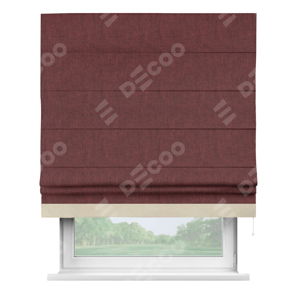 Римская штора производителя «Cortin», используется для проёма, пошита из ткани лён кашемир бордовый, артикул 17213. Отделка шторы кантом «Джестер», ткань для канта используется из льна разной расцветки на выбор. Имеет универсальный механизм и подходит для монтажа: на потолок, на стену и в нишу.