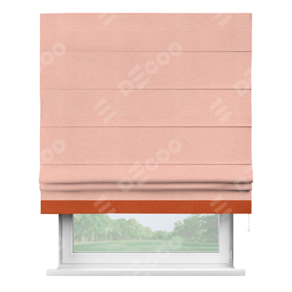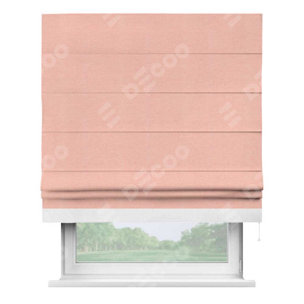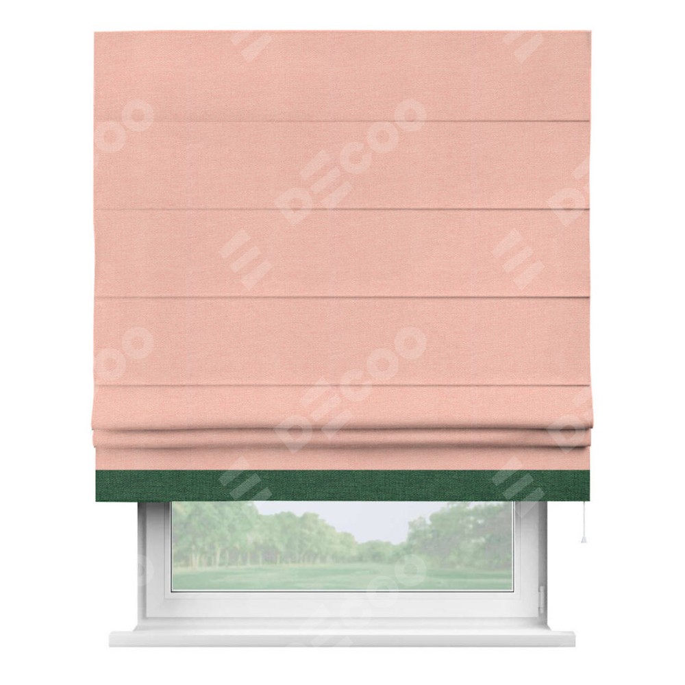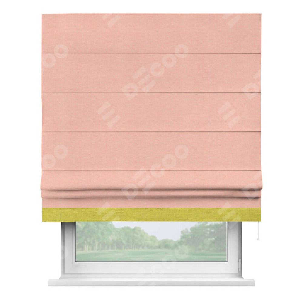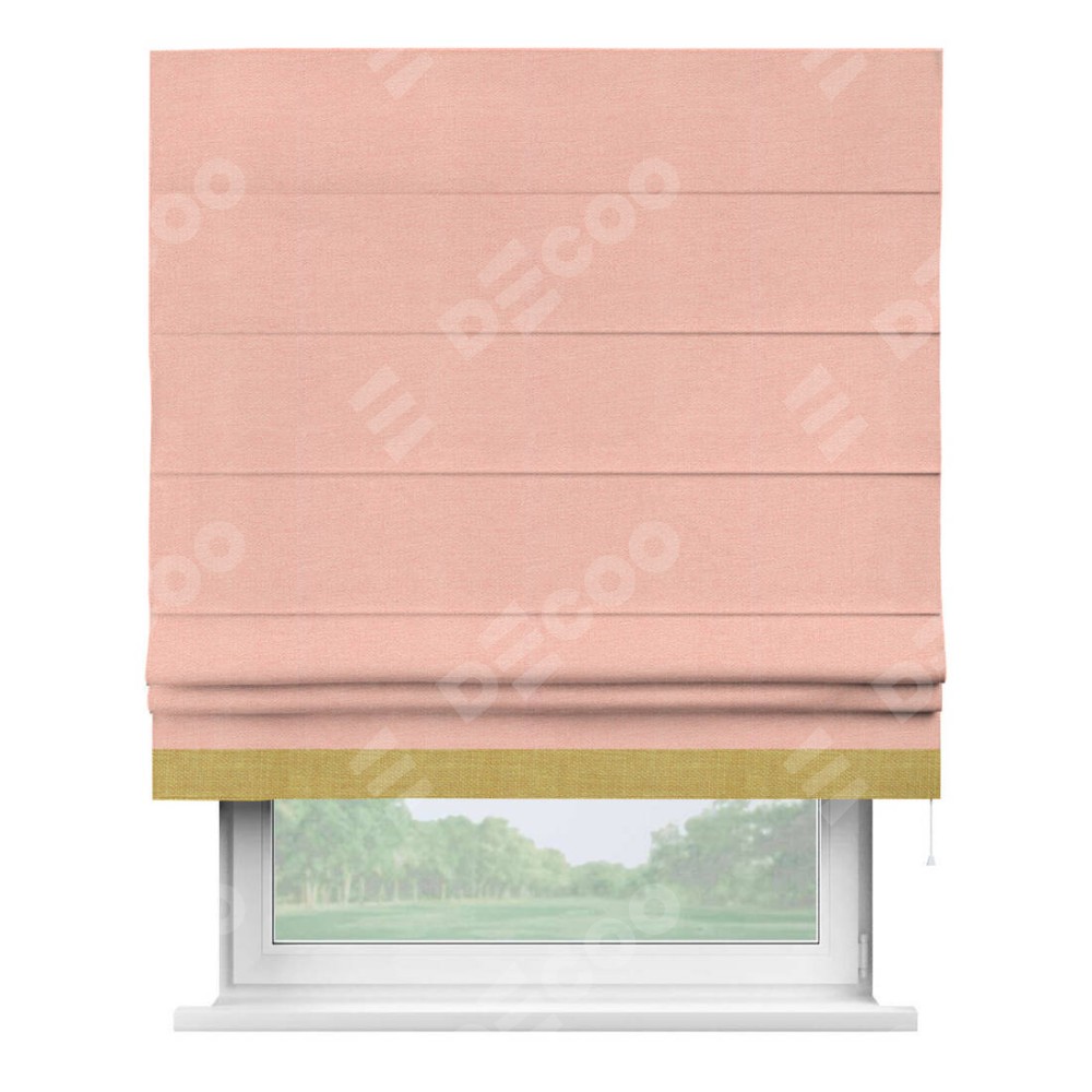 Римская штора производителя «Cortin», используется для проёма, пошита из ткани лён розовый, артикул 00005. Отделка шторы кантом «Джестер», ткань для канта используется из льна разной расцветки на выбор. Имеет универсальный механизм и подходит для монтажа: на потолок, на стену и в нишу.