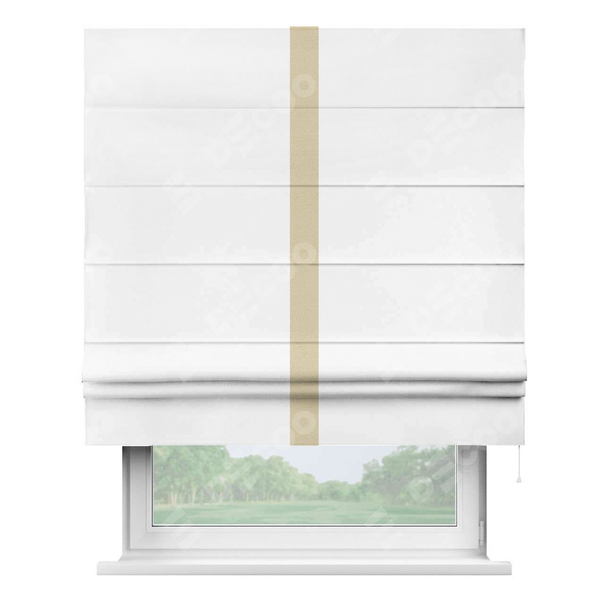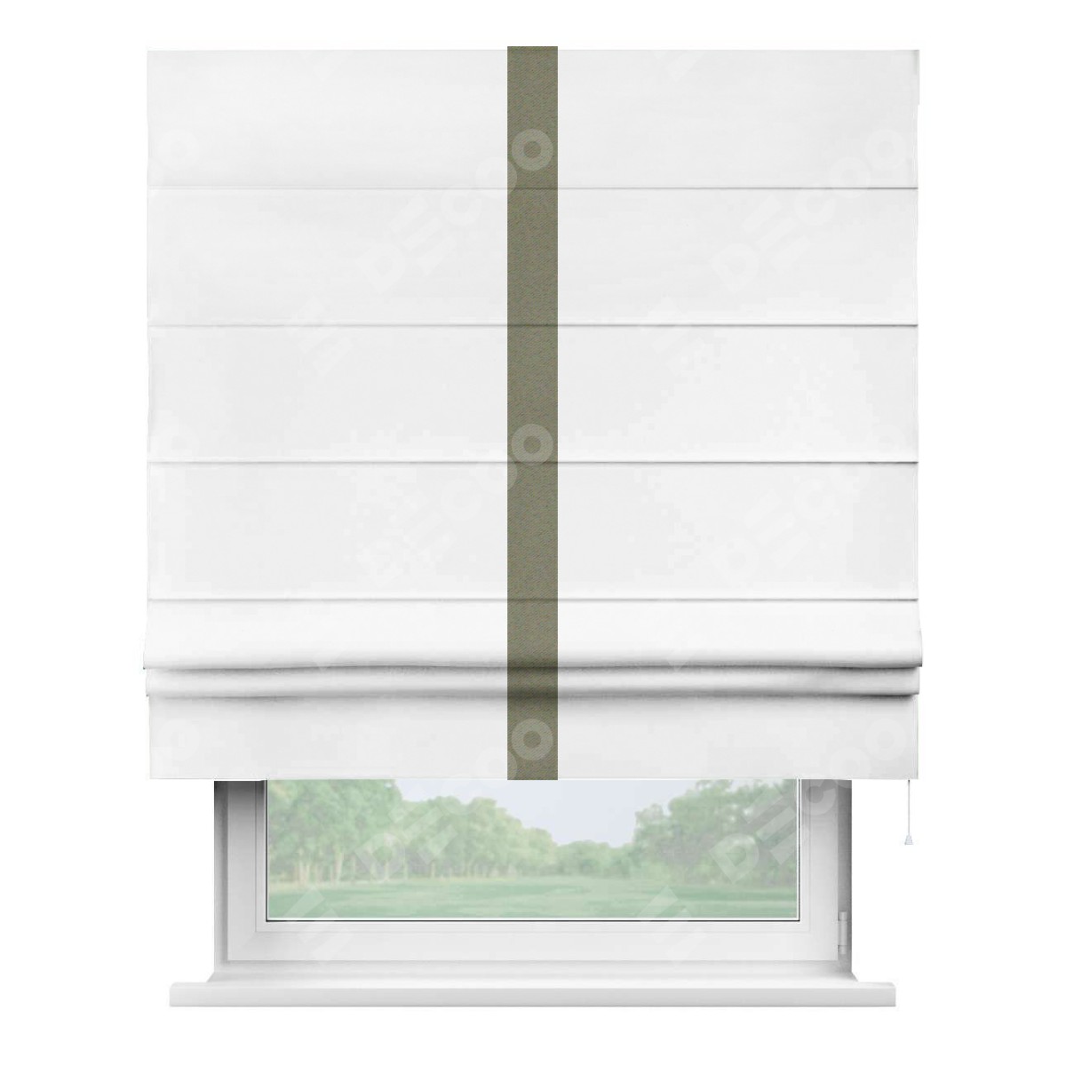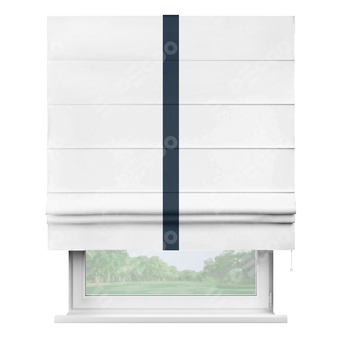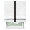Римская штора производителя «Cortin», используется для проёма, пошита из ткани однотонная белоснежная, артикул ткани 41217. Отделка шторы кантом «Хайвей», ткань для канта используется из блэкаута однотонного разной расцветки на выбор. Имеет универсальный механизм и подходит для монтажа: на потолок, на стену и в нишу.