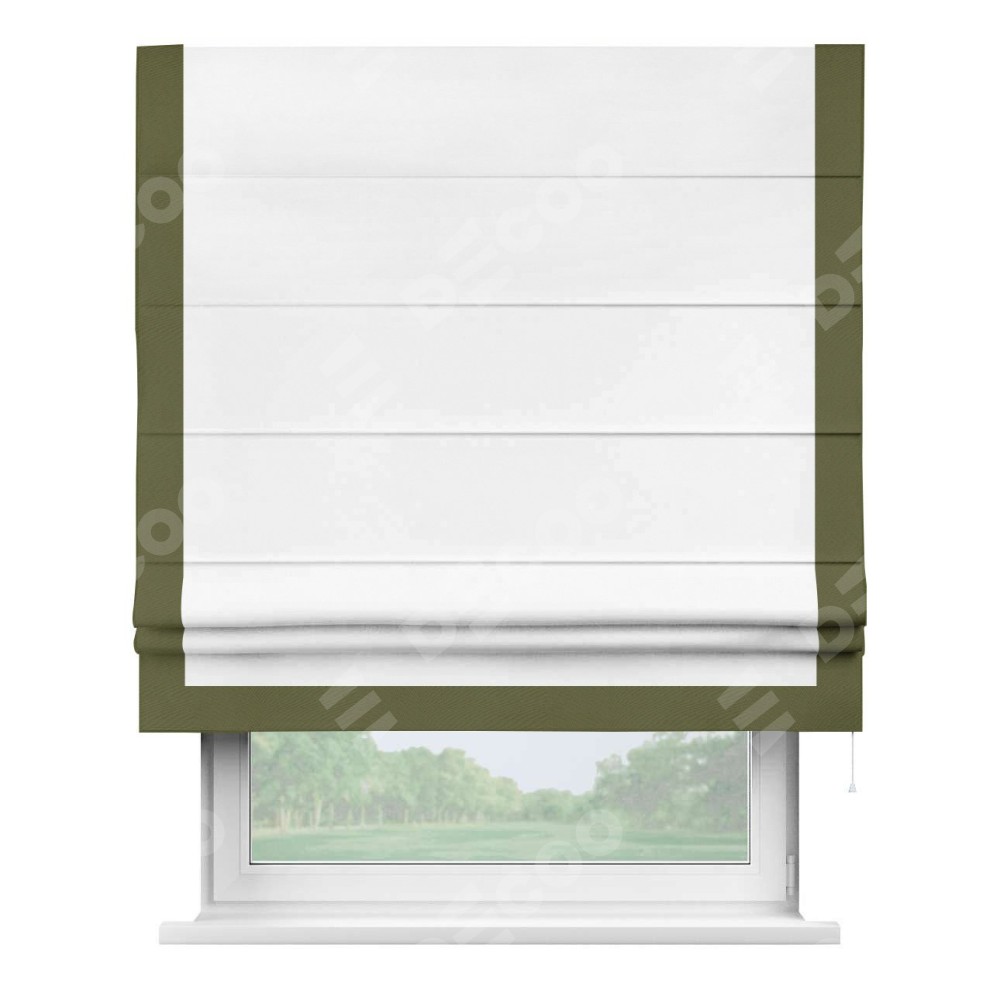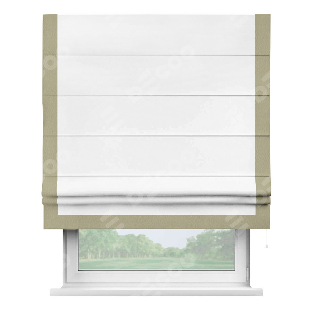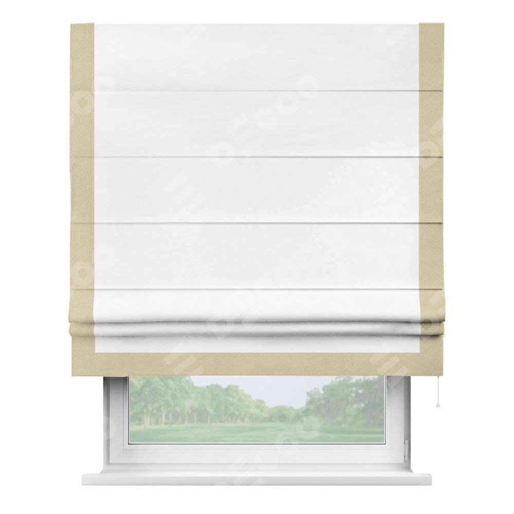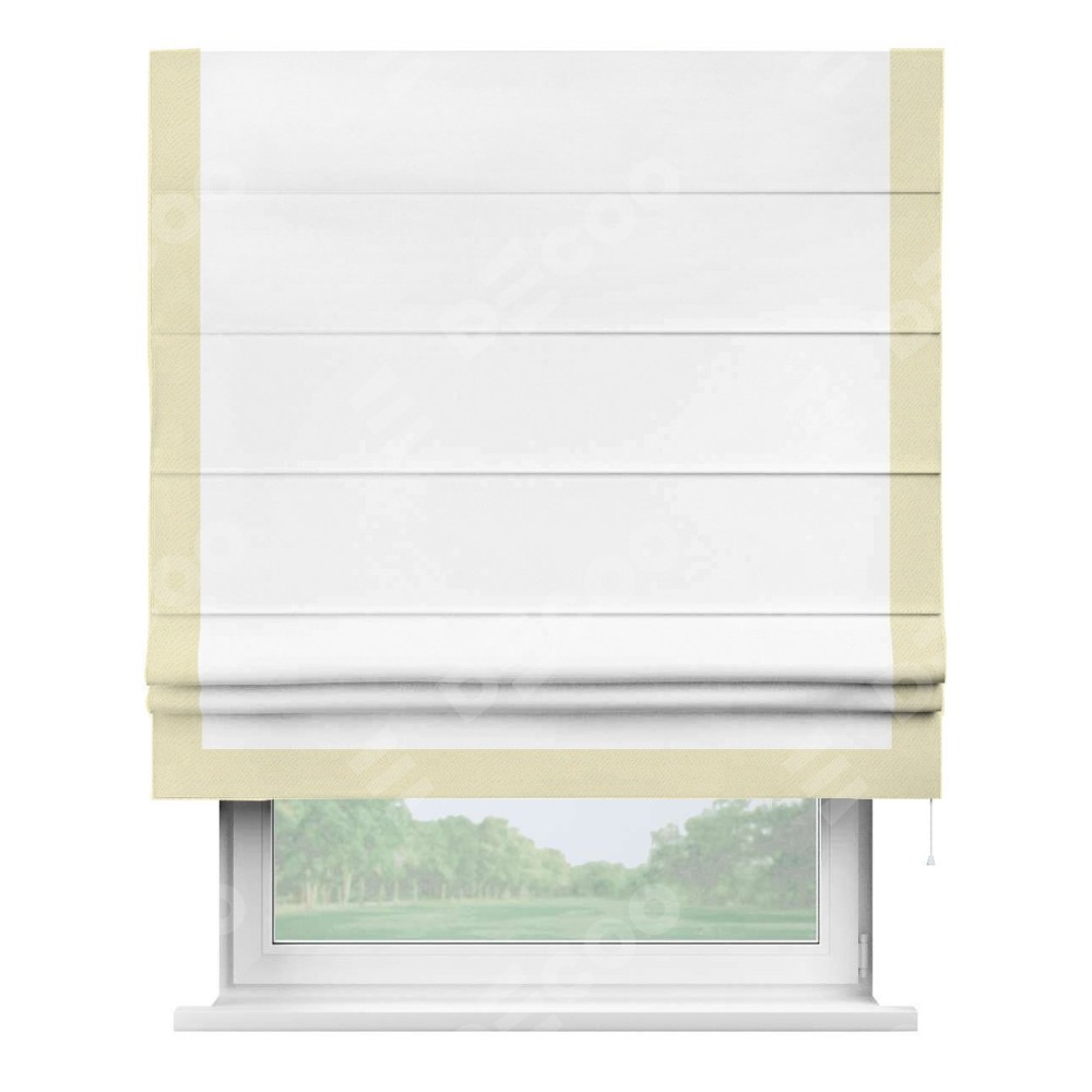 Римская штора производителя «Cortin», используется для проёма, пошита из ткани однотонная белоснежная, артикул ткани 41217. Отделка шторы кантом «Виктория», ткань для канта используется из блэкаута однотонного разной расцветки на выбор. Имеет универсальный механизм и подходит для монтажа: на потолок, на стену и в нишу.