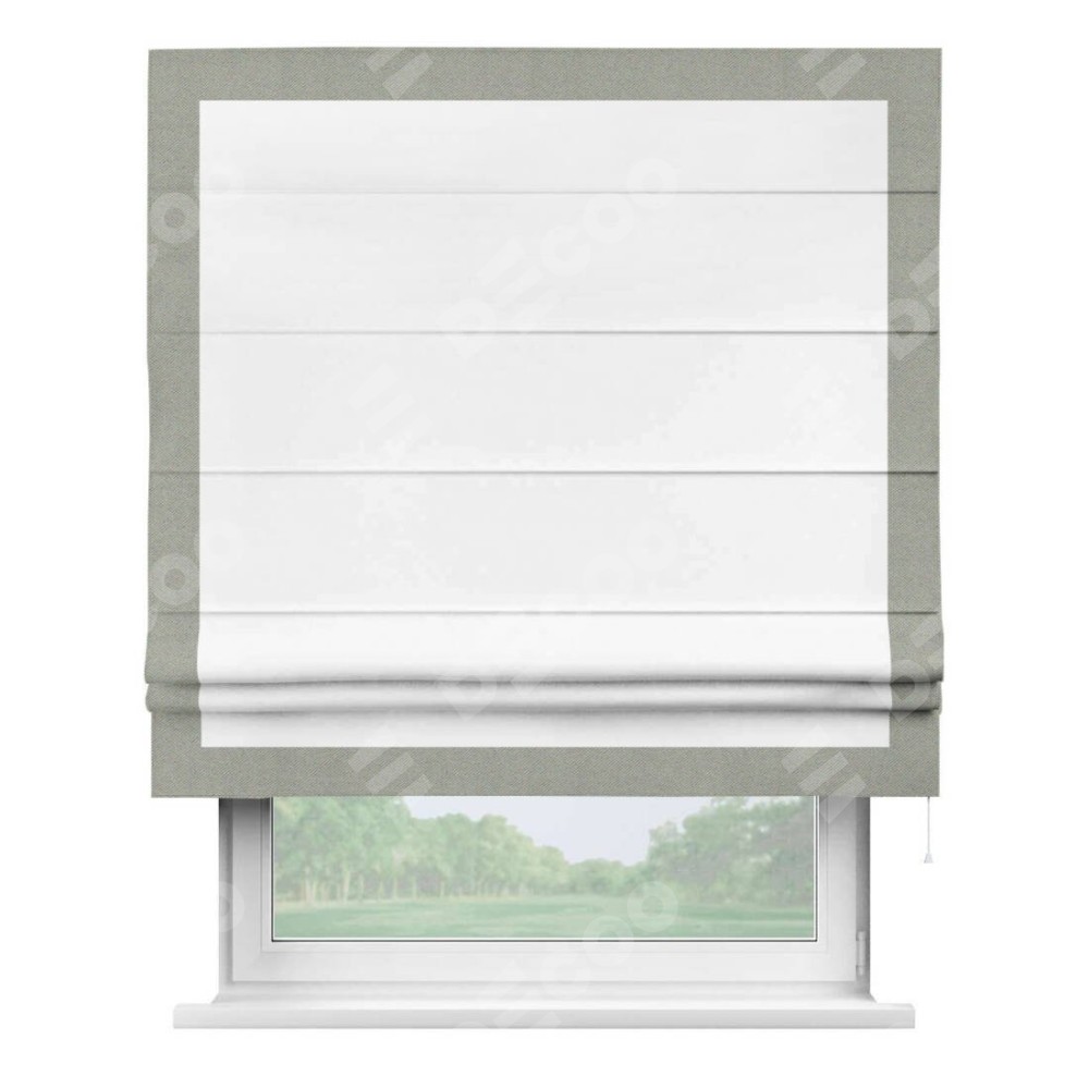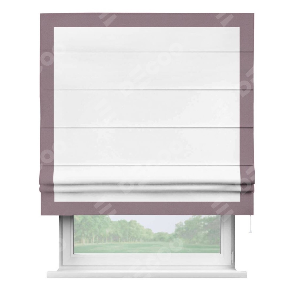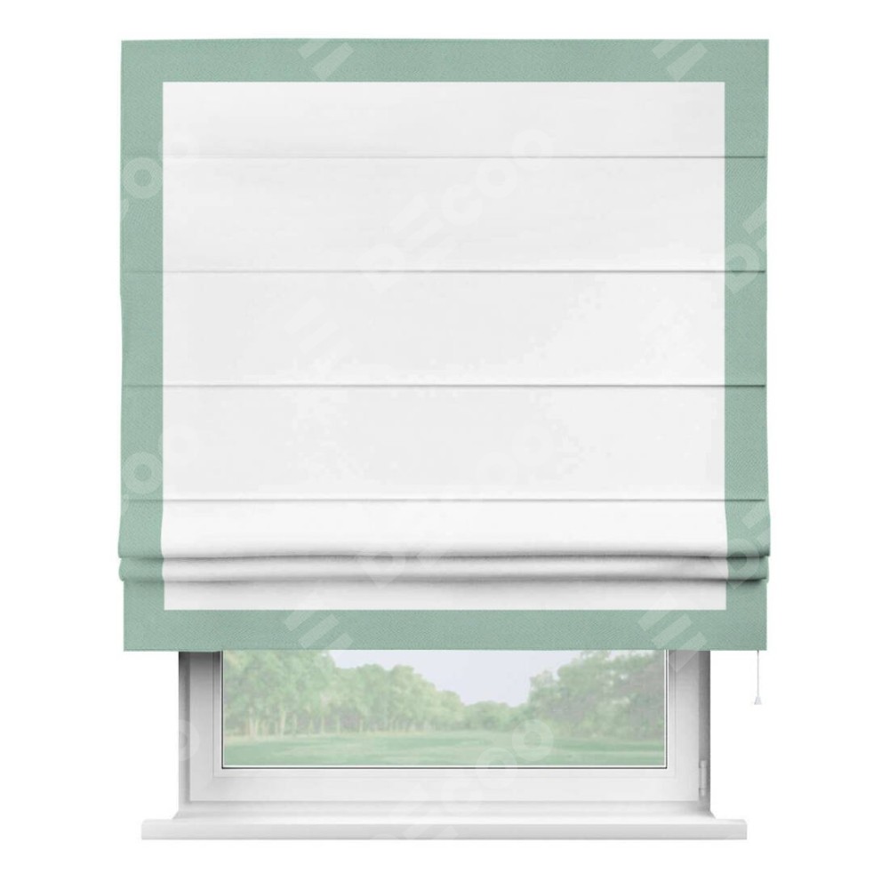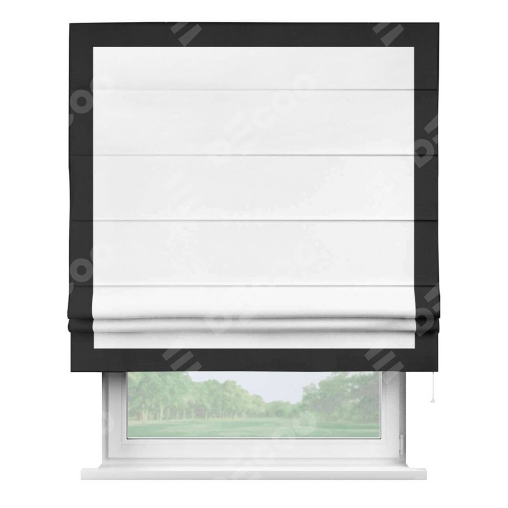 Римская штора производителя «Cortin», используется для проёма, пошита из ткани однотонная белоснежная, артикул ткани 41217. Отделка шторы кантом «Чесс», ткань для канта используется из блэкаута однотонного разной расцветки на выбор. Имеет универсальный механизм и подходит для монтажа: на потолок, на стену и в нишу.