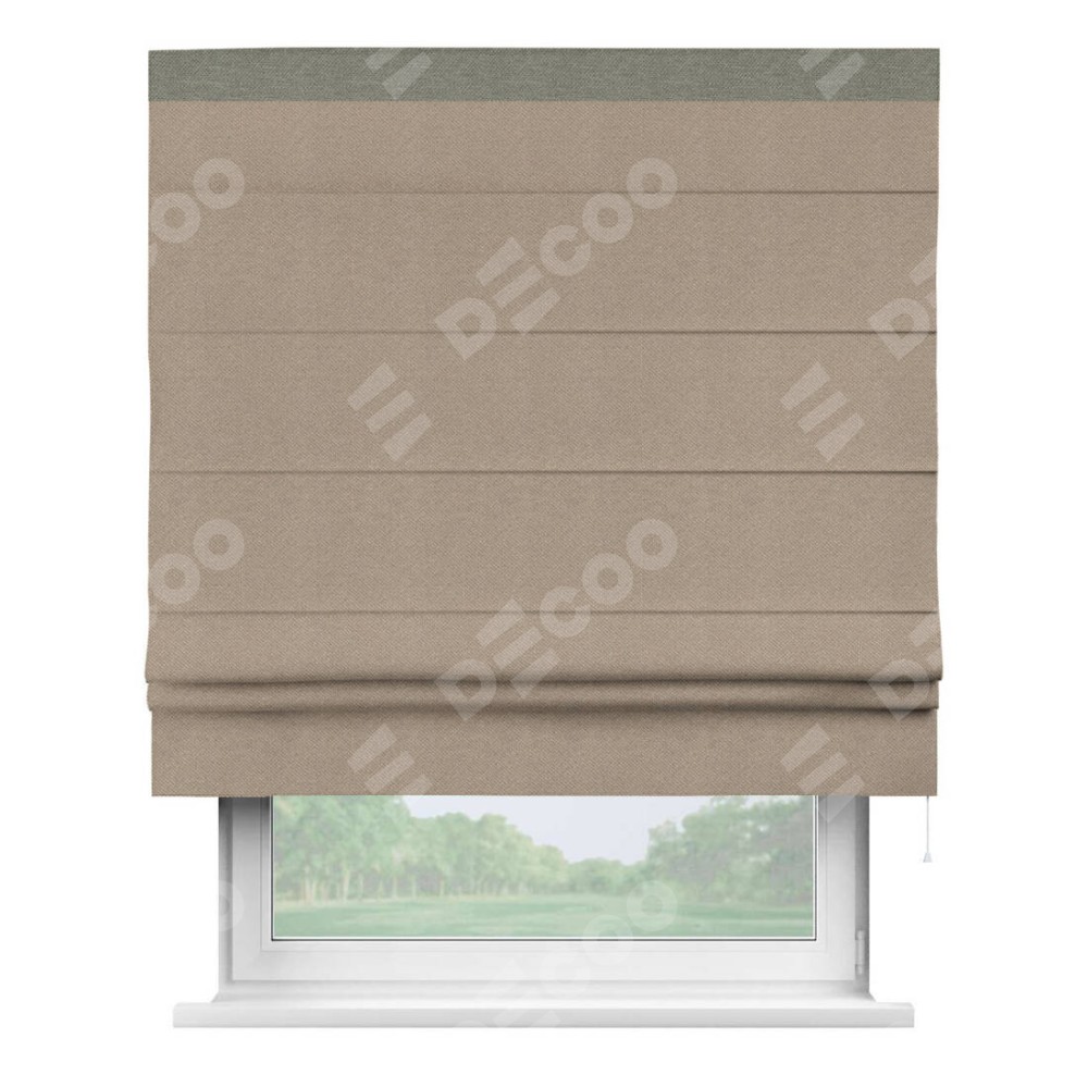 Римская штора производителя «Cortin», используется для проёма, пошита из ткани лён димаут светло-бежевый, артикул 00002. Отделка шторы кантом «Кинг», ткань для канта используется из льна димаут разной расцветки на выбор. Имеет универсальный механизм и подходит для монтажа: на потолок, на стену и в нишу.