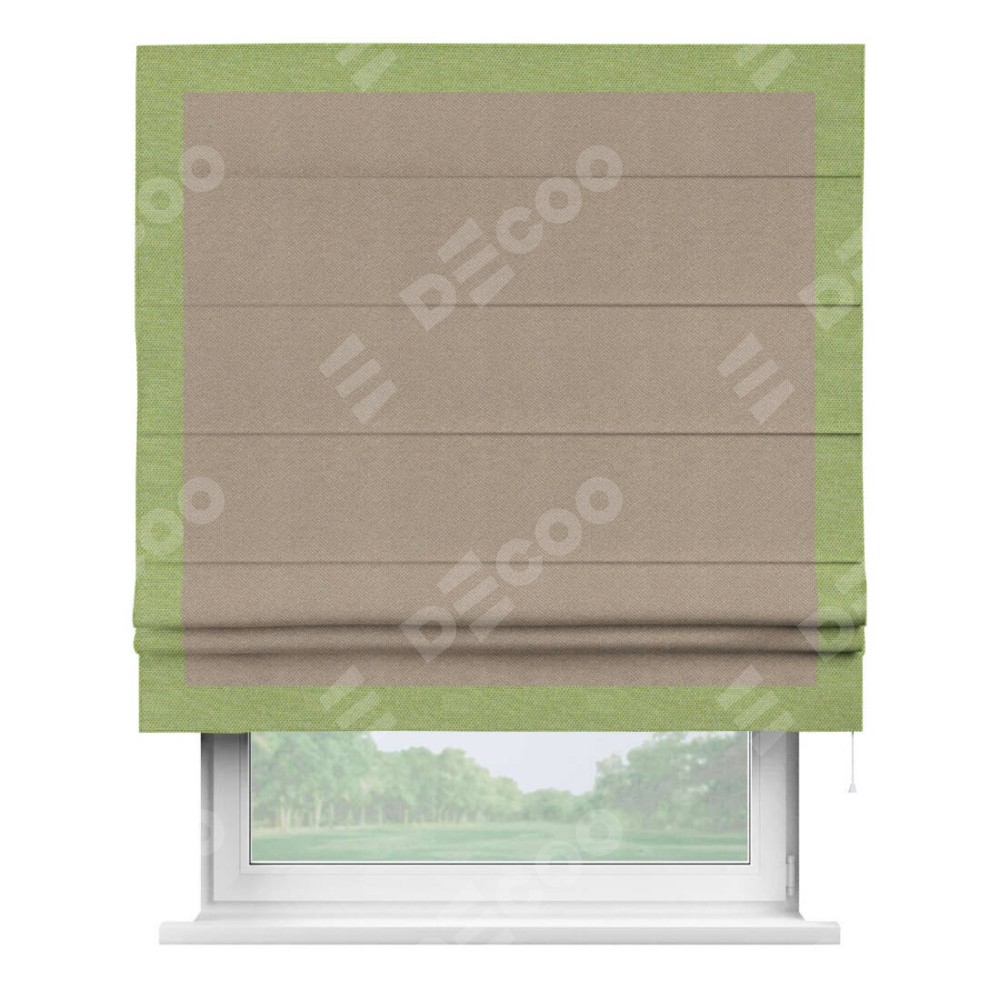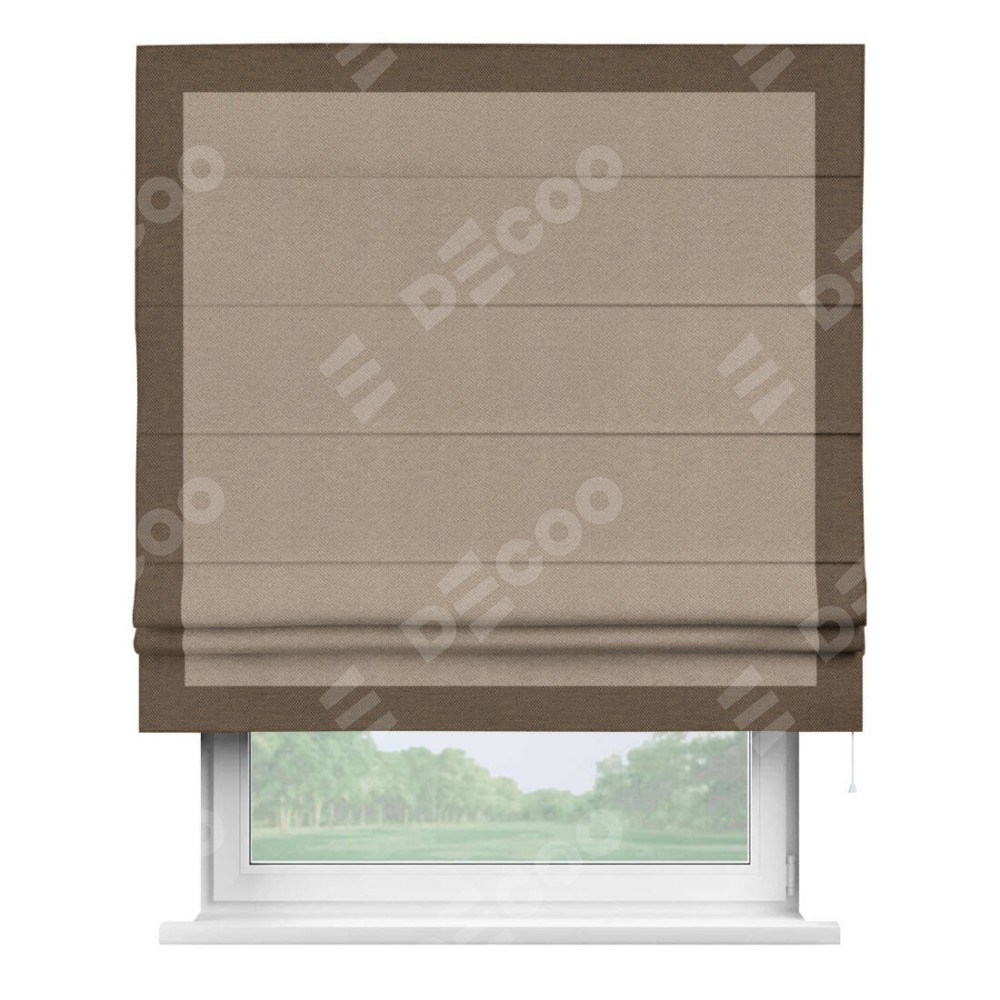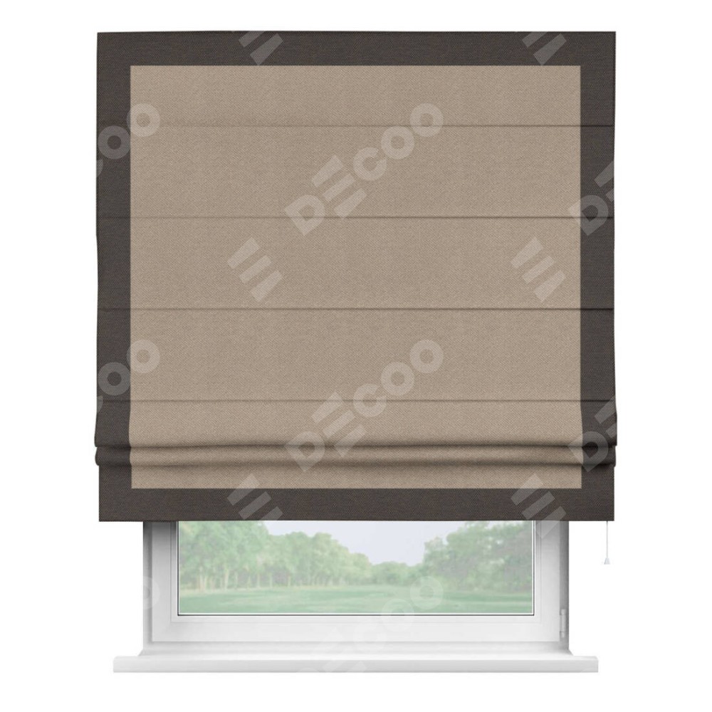 Римская штора производителя «Cortin», используется для проёма, пошита из ткани лён димаут светло-бежевый, артикул 00002. Отделка шторы кантом «Чесс», ткань для канта используется из льна димаут разной расцветки на выбор. Имеет универсальный механизм и подходит для монтажа: на потолок, на стену и в нишу.