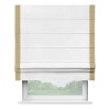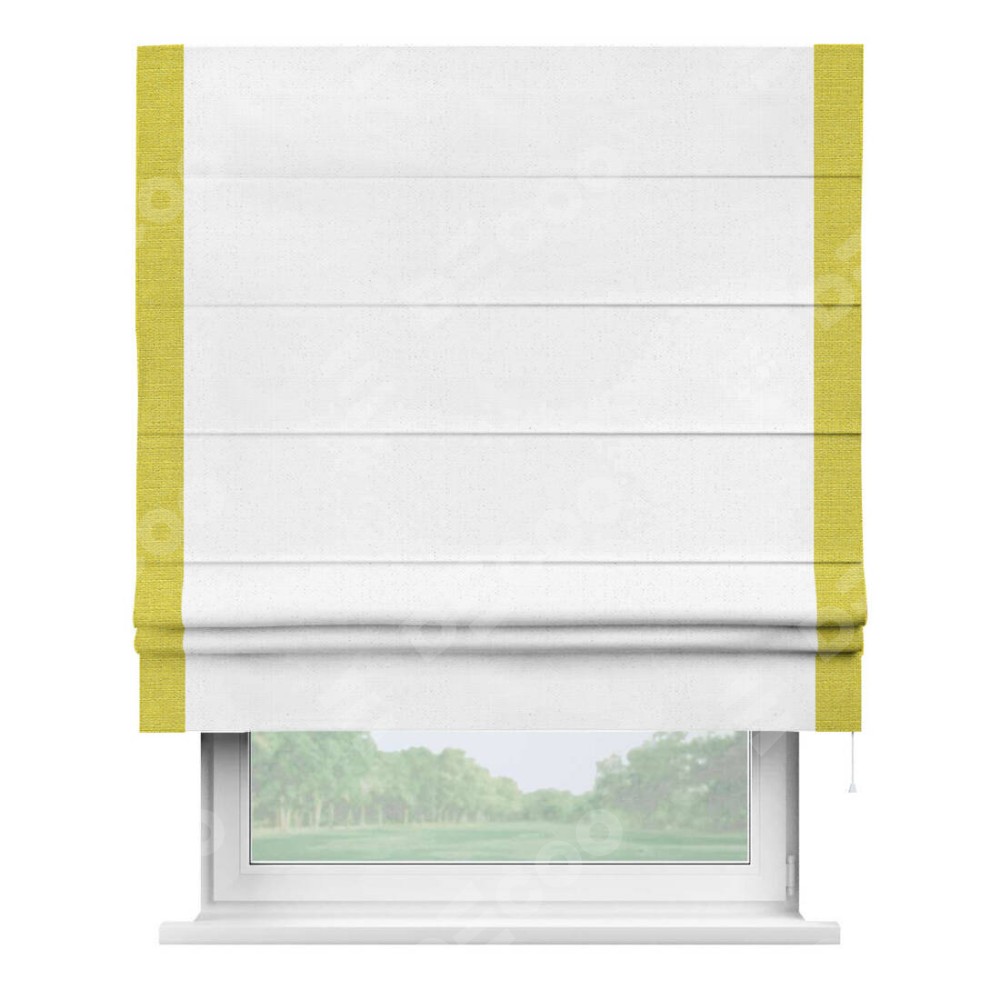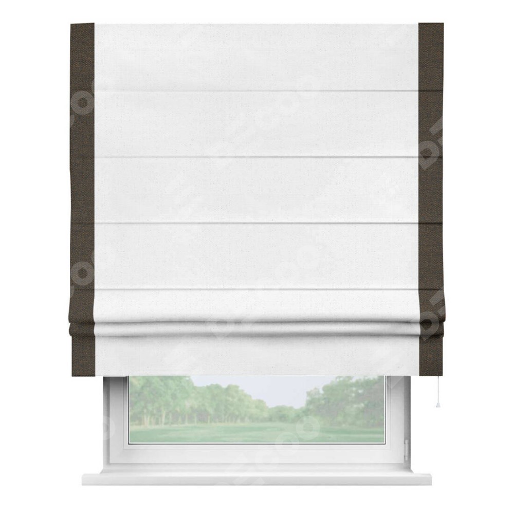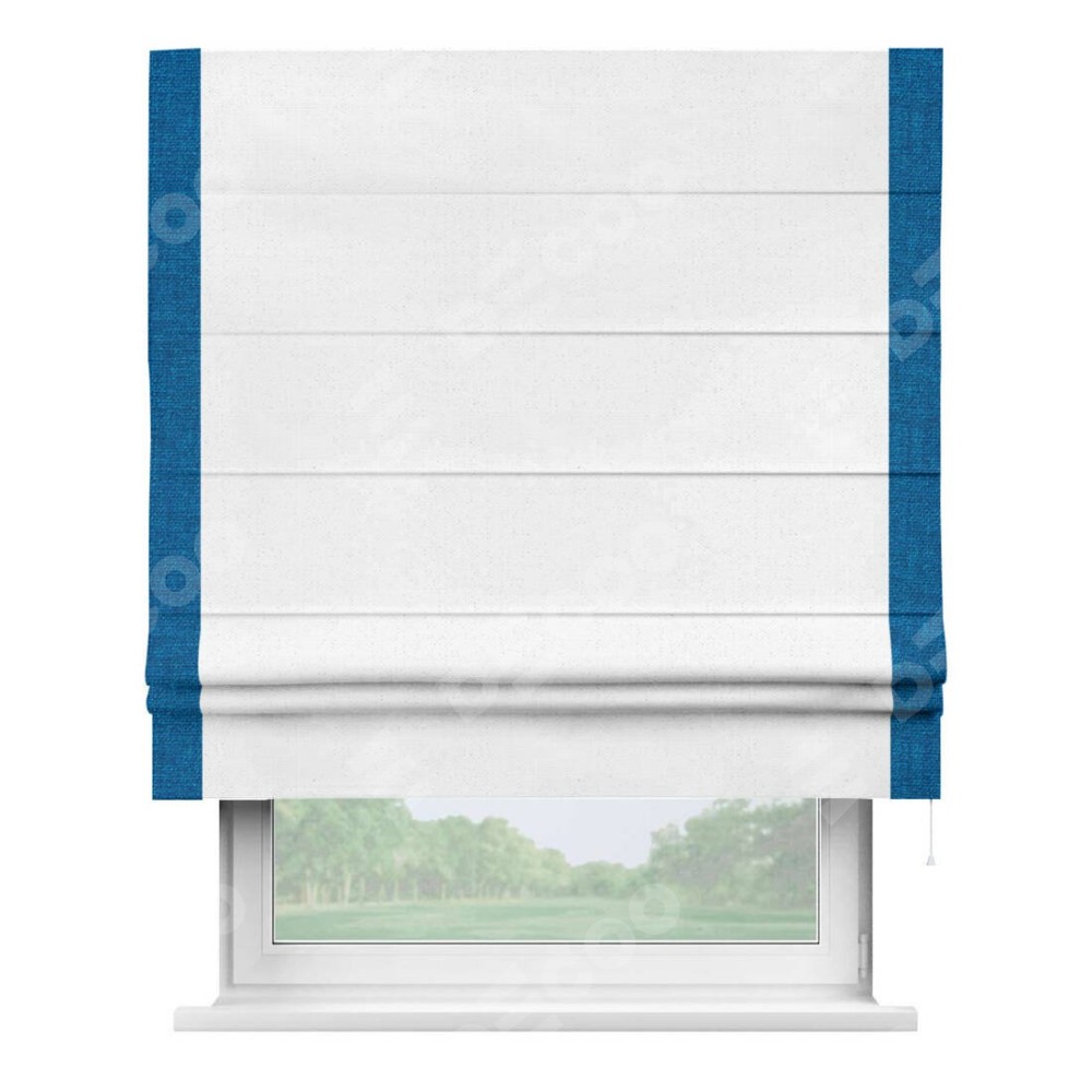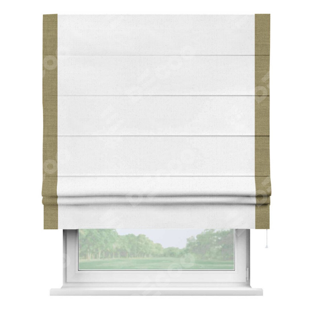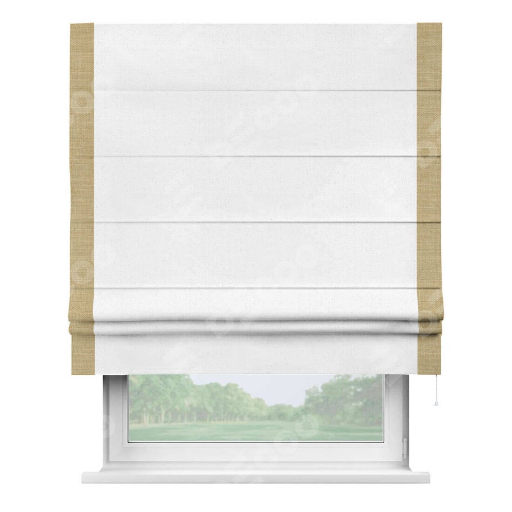 Римская штора производителя «Cortin», используется для проёма, пошита из ткани лён белый, артикул 7439. Отделка шторы кантом «Стрим Дуо», ткань для канта используется из льна разной расцветки на выбор. Имеет универсальный механизм и подходит для монтажа: на потолок, на стену и в нишу.