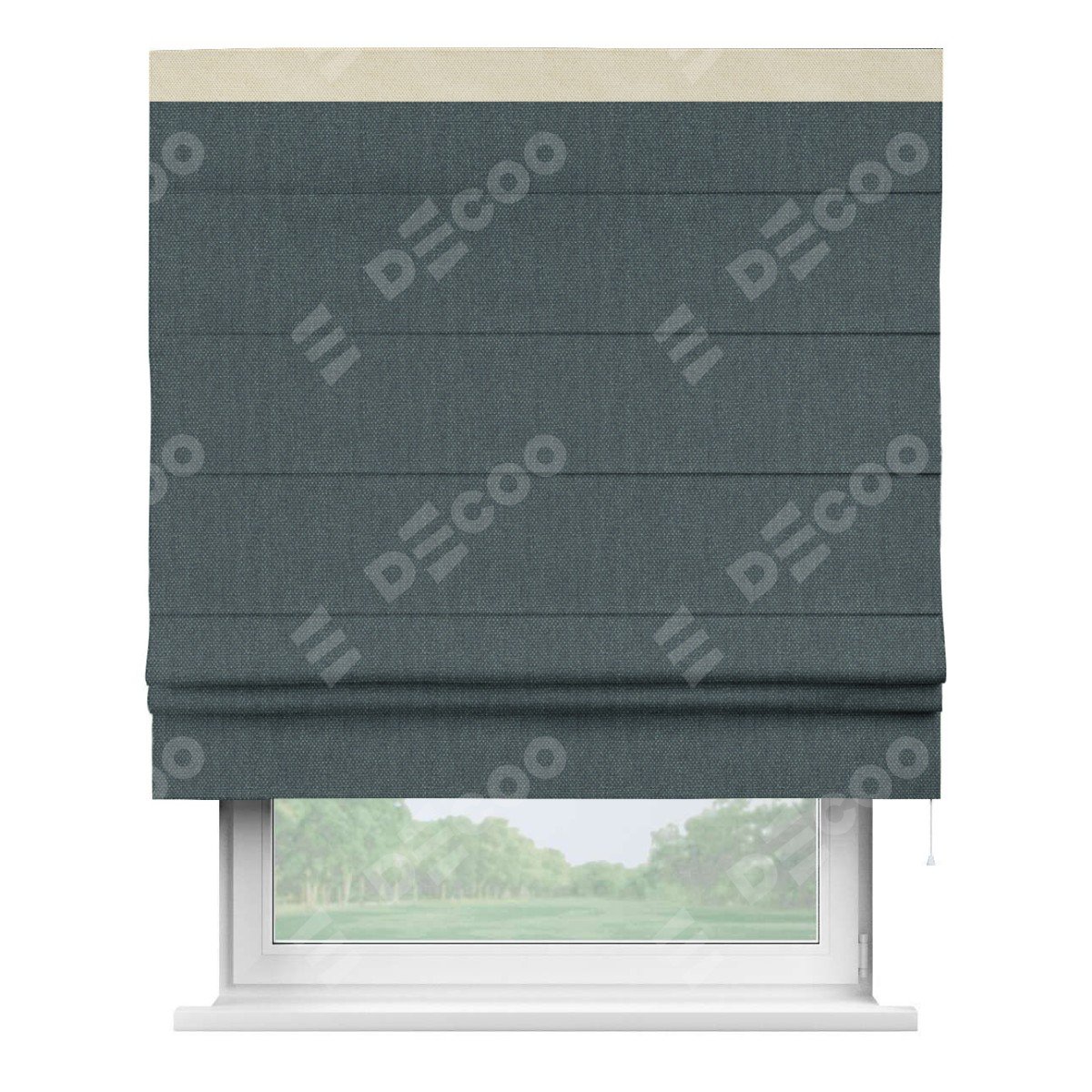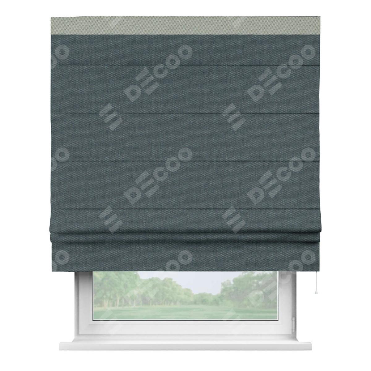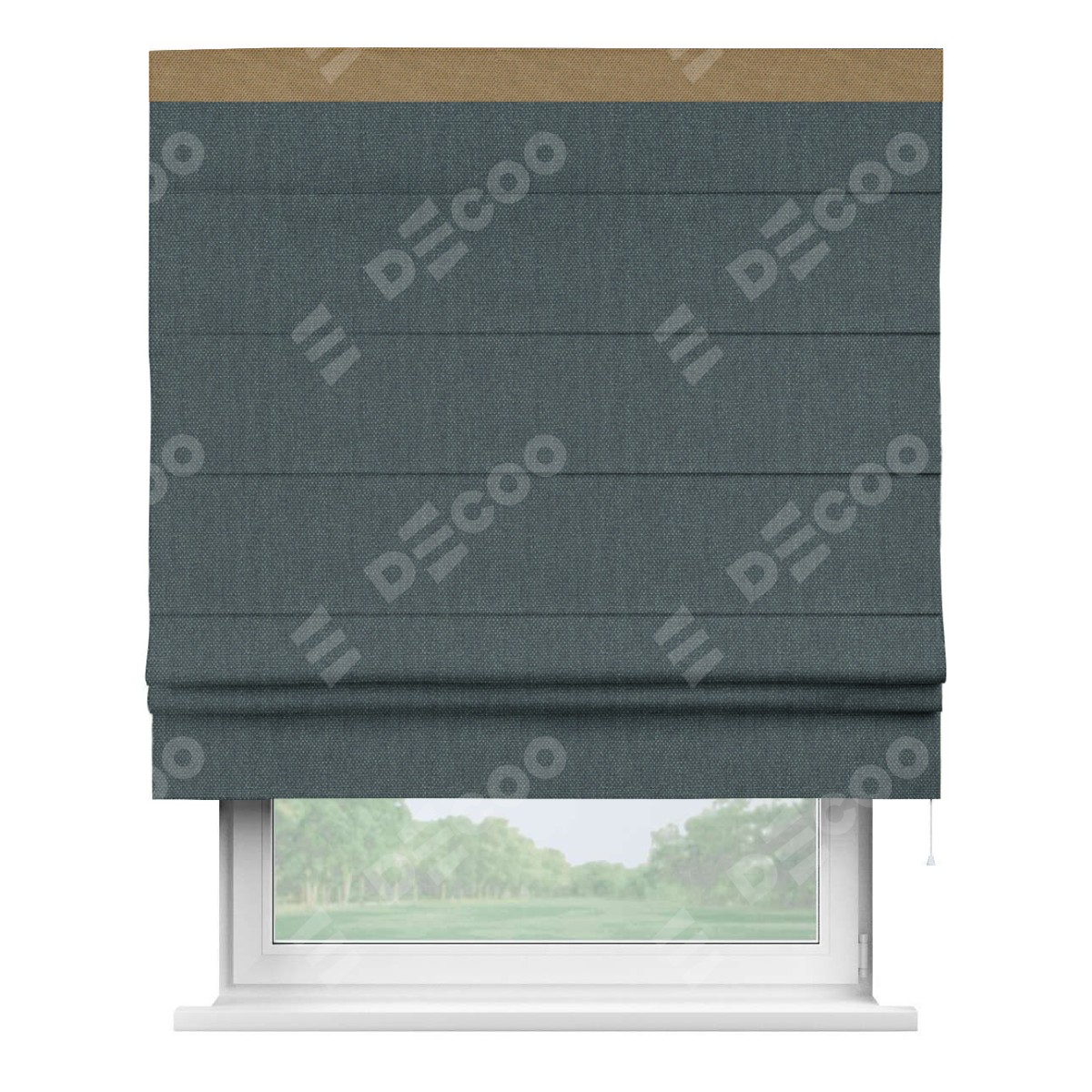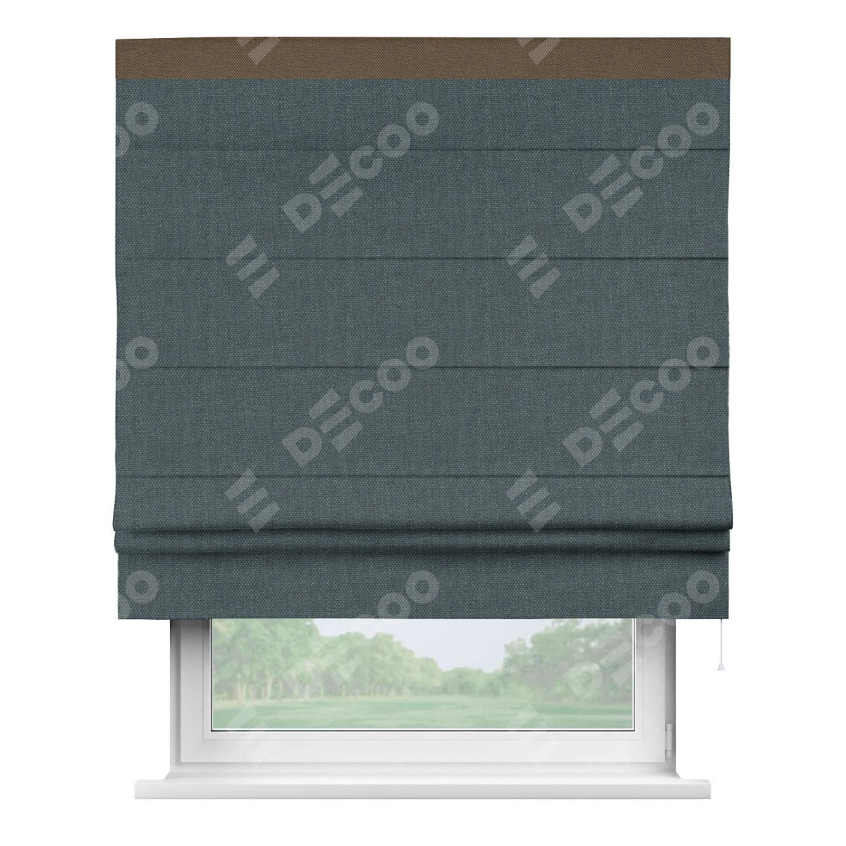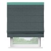 Римская штора производителя «Cortin», используется для проёма, пошита из ткани лён димаут серо-синий, артикул 03238. Отделка шторы кантом «Кинг», ткань для канта используется из льна димаут разной расцветки на выбор. Имеет универсальный механизм и подходит для монтажа: на потолок, на стену и в нишу.
