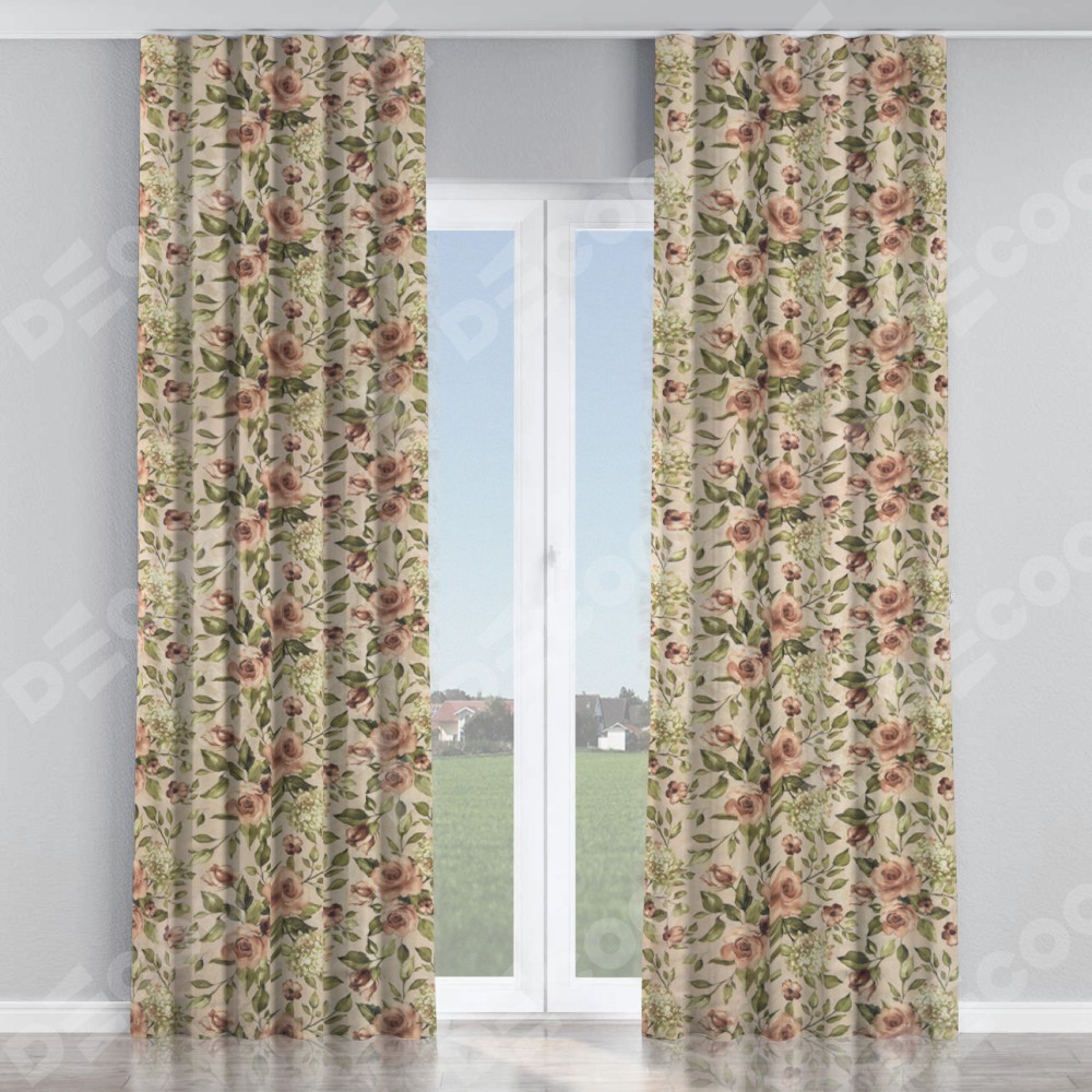 Комплект прямых штор, от производителя «Cortin», пошиты из ткани «Розы бежевые», артикул ткани 34564. С изнаночной стороны в верхней части штор пристрачивается шторная лента с декоративными складками «Волна». Для создания элегантных складок прямые шторы шьются по стандарту с коэффициентом 1:2 (на 100 см. ширины проёма 200 см. ширины ткани).