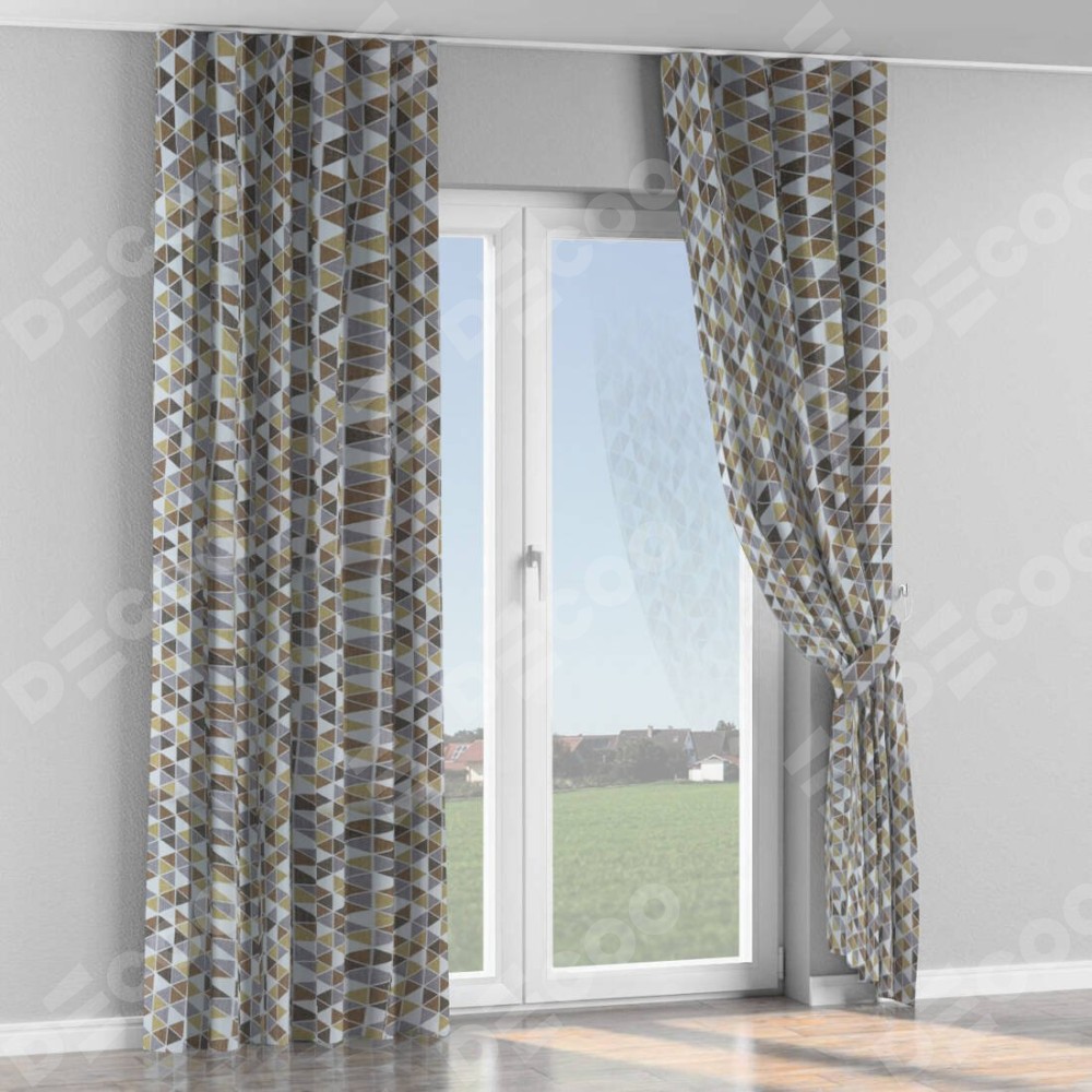 Комплект прямых штор, от производителя «Cortin», пошиты из ткани димаут «Треугольники коричневые», артикул ткани 23021. С изнаночной стороны в верхней части штор пристрачивается шторная лента с декоративными складками «Волна». Для создания элегантных складок прямые шторы шьются по стандарту с коэффициентом 1:2 (на 100 см. ширины проёма 200 см. ширины ткани).