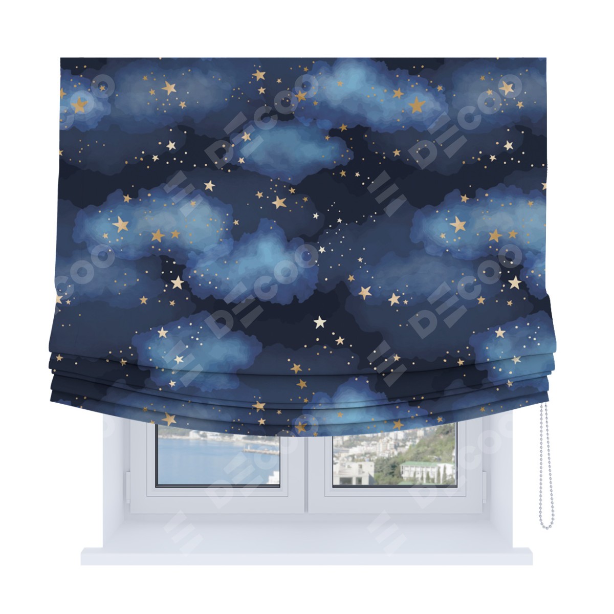 Римская штора Soft производителя «Cortin», используется для проёма, пошита из ткани блэкаут с нанесением сублимационной печати «Золотые звёзды». Имеет универсальный механизм и подходит для монтажа: на потолок, на стену и в нишу. В отличие от стандартных римских штор, римская штора Soft не имеет горизонтальных вставок и нижнего отвеса. Это позволяет ткани произвольно драпироваться в свободные мягкие складки.