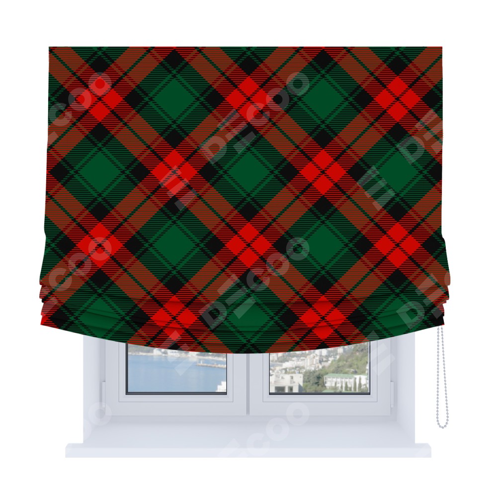 Римская штора Soft производителя «Cortin», используется для проёма, пошита из ткани блэкаут с нанесением сублимационной печати «Красно-зелёная клетка». Имеет универсальный механизм и подходит для монтажа: на потолок, на стену и в нишу. В отличие от стандартных римских штор, римская штора Soft не имеет горизонтальных вставок и нижнего отвеса. Это позволяет ткани произвольно драпироваться в свободные мягкие складки.
