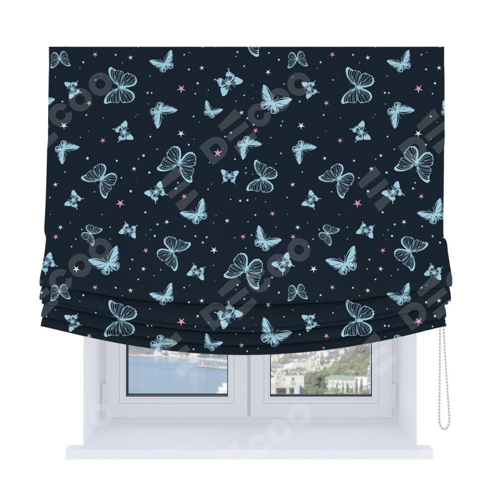 Римская штора Soft производителя «Cortin», используется для проёма, пошита из ткани блэкаут с нанесением сублимационной печати «Неоновые бабочки». Имеет универсальный механизм и подходит для монтажа: на потолок, на стену и в нишу. В отличие от стандартных римских штор, римская штора Soft не имеет горизонтальных вставок и нижнего отвеса. Это позволяет ткани произвольно драпироваться в свободные мягкие складки.