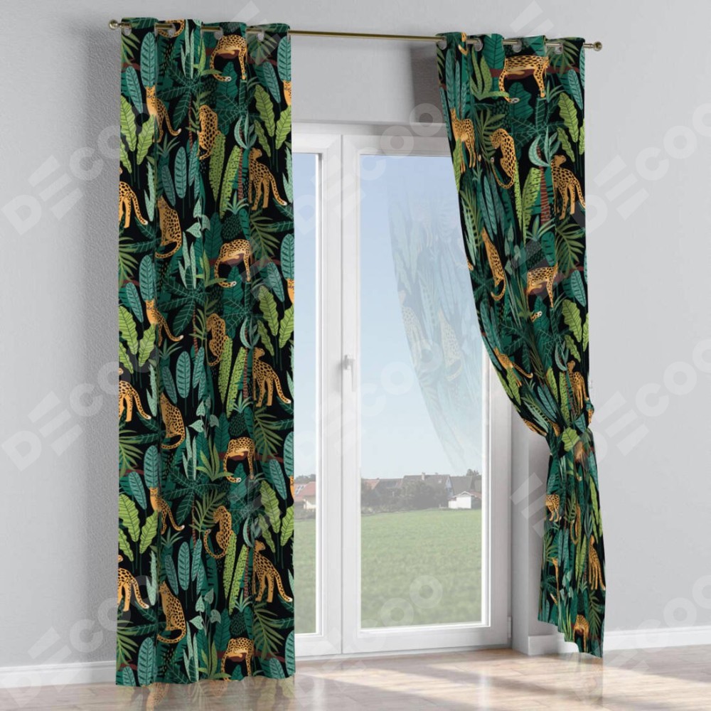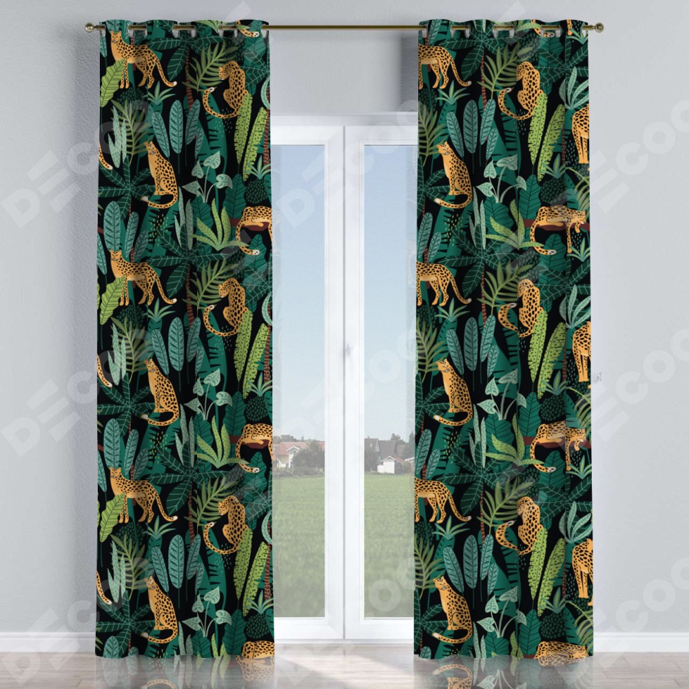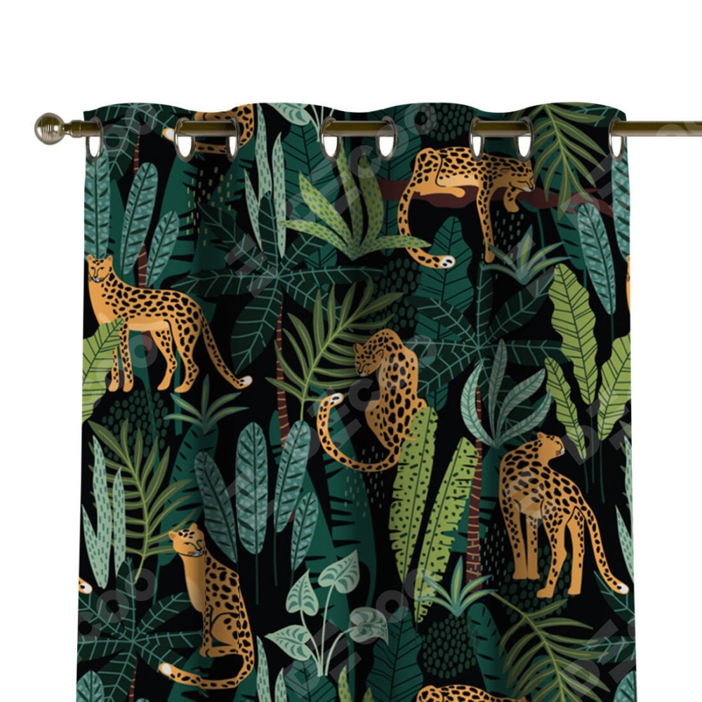 Комплект прямых штор, от производителя «Cortin», пошиты из ткани блэкаут с нанесением сублимационной печати «Леопарды в джунглях». Данная модель пошита на люверсах, комплектуется на выбор круглым карнизом и подходит для монтажа на стену или потолок. Прямые шторы на люверсах шьются по стандарту с коэффициентом 1/2 (на 100 см. ширины проёма 200 см. ширины ткани), отличительным преимуществом данной модели является простой способ монтажа. Достаточно повесить ее на трубу и штора готова!